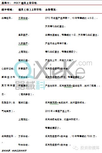 由于POCT市场高度细分,且过去每块领域国内市场规模不大, A股上市公司中主业为POCT的只有三诺生物一家,拟上市公司有万孚生物。但随着各块市场的高速增长,各个领域市场越来越成熟且形成一定规模,有POCT业务或正在进入这块业务的上市公司较多,POCT将成为部分企业未来的主导业务。