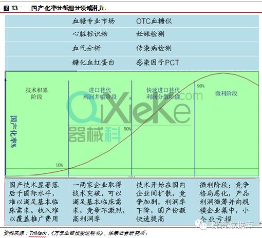 我们建立国产化率的分析模型来分析POCT各个细分领域的潜力。国产化率在10%-50%之间是最佳的投资阶段。低于10%反映国内技术不成熟需要较长的技术积累,不确定性较大。高于50%,竞争格局趋于恶化,企业将面临成长的天花板。