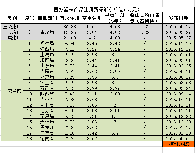 2017年5月4日,湖南省食品药品监督管理局发布《湖南省发展和改革委员会 湖南省财政厅关于重新发布食品药品监督管理部门行政事业性收费标准的暂行通知》(湘发改价费〔2017〕208号)(以下简称“通知”)。该通知自2017年4月25日起执行。《通知》中与医疗器械相关的内容包括: 1、公布省内第二类医疗器械的产品注册收费标准; 2、明确产品注册加急申请时收取加急费; 3、公布省医疗器械委托性检验收费标准。 湖南省境内第二类医疗器械的注册收费标准