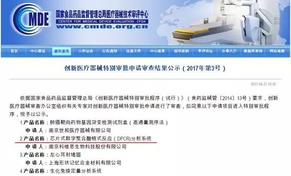 2017年5月27日,依据国家食品药品监督管理总局《创新医疗器械特别审批程序(试行)》(食药监械管〔2014〕13号)要求,国家食品药品监督管理总局医疗器械技术审评中心公示了30个IVD类创新医疗器械特殊审批结果 其中有一项是芯片式数字聚合酶链式反应(DPCR)分析系统,这就意味着,该数字PCR相关产品将进入“绿色通道”,或将成为中国乃至全球的第一款基于数字PCR的检测设备! 创新医疗器械审批通过率仅14.7%,标准是什么? 2014年2月7日,国家食品药品监督管理总局为了保障医疗器械的安全、有效,鼓励医疗器械的研究与创新,促进医疗器械新技术的推广和应用,推动医疗器械产业发展,根据《医疗器械监督管理条例》、《医疗器械注册管理办法》等法规和规章,制定了创新医疗器械特别审批程序,迄今,这一特别审批的通过率仅14.7%! 如此残酷的通过率,得益于国家对于创新医疗器械严苛的审批标准: 1、核心技术发明专利权 审批申请人经过其技术创新活动,在中国依法拥有产品核心技术发明专利权,或者依法通过受让取得在中国发明专利权或其使用权;或者核心技术发明专利的申请已由国务院专利行政部门公开。 2、国内首创 产品主要工作原理/作用机理为国内首创,产品性能或者安全性与同类产品比较有根本性改进,技术上处于国际领先水平,并且具有显著的临床应用价值。 3、产品基本定型 申请人已完成产品的前期研究并具有基本定型产品,研究过程真实和受控,研究数据完整和可溯源。 DPCR分析系统特殊在何处? 先来看看国家食品药品监督管理总局对其工作原理的描述:对目标核酸序列定量和定性检测,用聚合酶链式反应分析法,将具有荧光定量PCR的反应物(TaqMan探针法或SYBR绿色引物法)加载到芯片上,然后用dPCR扩增仪进行热循环反应。芯片反应完成后放到dPCR分析仪上进行成像和分析,输出原始数据,将原始数据放到云端的dPCR软件上分析,并得到最终结果。仪器每处理一个芯片,只要一分钟仪器就能读完芯片。 数字PCR是一种新的核酸检测和定量方法,与传统PCR技术不同,数字PCR采用绝对定量的方式,采用的策略概括起来非常简单,就是“分而治之”,类似于计算机科学中的“分治算法”,将一个标准PCR反应分配到大量微小的反应器中,在每个反应器中包含或不包含一个或多个拷贝的目标分子( DNA模板) ,实现“单分子模板PCR扩增”,扩增结束后,通过阳性反应器的数目“数出”目标序列的拷贝数,特别适合在复杂背景中检测稀有突变。