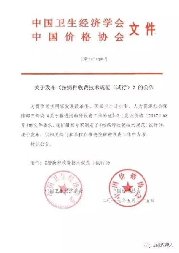近日,一份来自中国卫生经济学会和中国价格协会的文件显示,为贯彻落实国家发展改革委、国家卫生计生委、人力资源社会保障部三部委《关于推进按病种收费工作的通知》文件要求,最新的《按病种收费技术规范(试行)》已经经专家制定并进行发布,供相关部门和单位在推进按病种收费工作中参考。