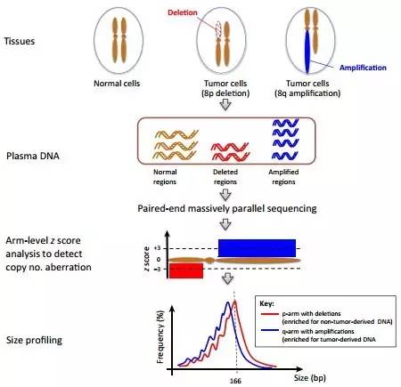 这种从qPCR获得的看似不同的结果出现困惑和难以调和。在2015年,有一项研究试图调和这些明显矛盾的结果(见下图),用配对末端的大规模平行测序对延长和缩短的癌症患者血浆中的DNA进行分析。这比测定胎儿的基因大小分布更具有挑战性,因为肿瘤衍生的血浆DNA不是很容易区分与血浆中非肿瘤来源的背景。尽管癌症特异性突变的检测提供了一种基因型的方法来区分肿瘤与非肿瘤细胞DNA,但只有有限数量的癌症特异性突变存在。大规模平行测序的分析显示在肝癌患者血浆中循环DNA大小谱显示显著的166bp的峰,以及一系列10bp为周期渐减小的峰,和在怀孕妇女和器官移植的受体病人中类似。血浆中肿瘤DNA的量越大,低于150bp的短DNA片段比例越高。