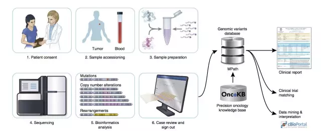 MSK-IMPACT流程图 从先前的MSK-IMPACTTM的工作流程图,我们可以看到,患者首先要签订肿瘤与正常序列配对分析的知情同意书,然后研究人员收集患者的血液样本作为正常DNA的来源,利用自动化的方法来提取肿瘤和血液样本的DNA,并使用靶向基因的所有编码外显子的杂交探针来制备文库,随后是测序、数据分析。所生成的数据结果加载到自家开发的基因变异数据库中,并手动检测数据的质量和精度。基因组变化会在电子病历报告中显示,并被发送到机构开发的数据库中,这有利于自动化临床试验匹配,变异数据还会自动上传到cBioPortal中进行挖掘以及解读。 据了解,目前研究人员们已经使用MSK-IMPACTTM对MSK两万多名各类实体肿瘤患者进行测序。他们最关键的研究思路就是:利用正常组织与肿瘤组织相匹配,以汇编各个肿瘤的体细胞突变目录。从这个方向努力,研究人员生成了一个无与伦比的数据集。这个数据集包含了晚期癌症患者的癌变组织和正常组织的DNA序列、相关病理与临床注释数据。该数据集对确定新的生物标志物以及预测后续治疗反应有重要的意义。 此外,MSK-IMPACTTM所生成的数据集对外共享(共享网址:http://cbioportal.org/msk-impact),全世界的研究者可以免费访问,以便发现新的生物标志物以及针对罕见突变开展更深入的研究。 参考资料 FDA Authorizes MSK-IMPACT Test for Analyzing Patient Tumors 临床测序重磅成果!300多种肿瘤,“无与伦比”的突变数据集问世 |