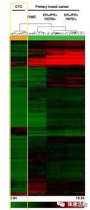 研究人员对这些患者的CTC进行了全基因组的mRNA芯片检测,并将其结果与31例原发性乳腺癌(pBC)患者的基因表达数据进行对比,并得出两个重要发现:1.CTC中表达下调的基因远远多于表达上调的基因,这说明一般情况下CTC的基因转录活动并不频繁。2.CTC基因表达图谱自成一派,果然是物以类聚。