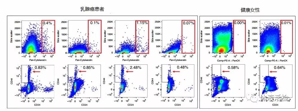 该研究纳入了10例转移性乳腺癌患者和3例健康志愿者,采用了多参数流式细胞术来捕获、分离和鉴定CTC,并将捕获的CTC分为上皮型(Pan CK+)和类干细胞型(CD44+/CD24-)。研究人员发现患者体内这两种亚型的CTC不仅出现频率高,而且表面的生物标志物表达量也高于健康人。这两种亚型的CTC大概就是传说中的害群之马了。