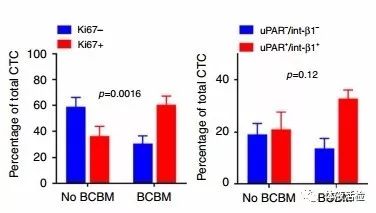 研究纳入了16例乳腺癌患者,其中8例乳腺癌脑转移(BCBM)患者,8例no BCBM。并探究了两组与细胞行为相关的标志物,一组是与乳腺癌细胞增殖和脑转移预后显著相关的Ki67,另一组是与乳腺癌细胞休眠和复活直接相关的uPAR/int-β1。试验结果显示,BCBM患者体内Ki67高表达的CTC数目是Ki67低表达CTC数目的两倍,而no BCBM患者体内Ki67低表达的CTC占到60%以上。此外,BCBM患者体内uPAR+/int-β1+ CTC也远多于uPAR-/int-β1- CTC。种种现象说明,BCBM患者体内有一部分特殊亚型的CTC与其它CTC生物学和行为特征不同