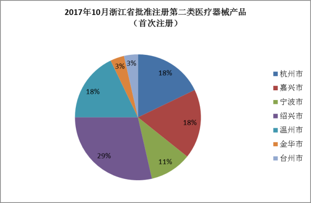 2017年10月,浙江省食品药品监督管理局共批准注册第二类医疗器械产品110个,其中首次注册28个,包括有源类6个,无源类11个,体外诊断试剂11个;延续注册82个,包括有源类2个,无源类5个,体外诊断试剂75个。