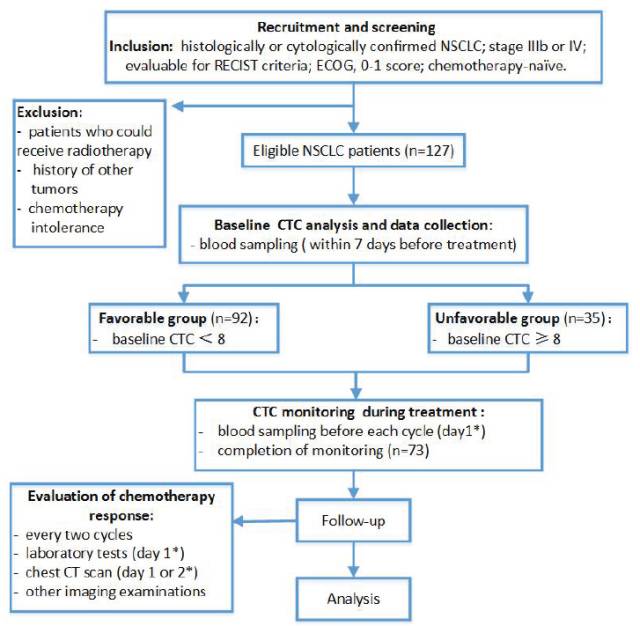 背景 近几年来科学家们都在努力寻找评估晚期非小细胞肺癌患者预后和治疗疗效的分子标志物。循环肿瘤细胞已在转移性乳腺癌,结直肠癌和前列腺癌的预后评估中展现出了较好的作用,越来越多的证据显示在肺癌中具有同样的指导作用。在前期的探索性研究中发现基线CTC数目可作为晚期非小细胞肺癌独立的预后评估因子,但是尚未建立与疗效监测的相关性。本研究扩大样本量进一步验证了基线CTC和治疗过程中CTC变化在预测晚期非小细胞肺癌患者预后和化疗疗效中的临床价值。 从2012年9月到2015年9月,共纳入127例拟接受化疗的初诊晚期非小细胞肺癌患者(Ⅲb期或Ⅳ期)。(图1)患者随后在北京协和医院接受标准的一线铂类化疗。开始化疗前七天内(基线)抽取患者3.2ml血通过莱尔生物的阴性富集+imFISH技术检测患者的CTC。按之前建立的标准,CTC≥2个定义为CTC阳性。以8为cut-off值,将患者分为预后良好组(CTC<8)和预后不良组(CTC≥8)。研究中进一步验证基线CTC与OS,PFS和治疗疗效的关系。进一步,在患者每周期化疗前取血动态检测CTC,并通过影像学RECIST标准评估患者的治疗疗效,探讨CTC变化与治疗疗效的相关性。 图1 研究流程图