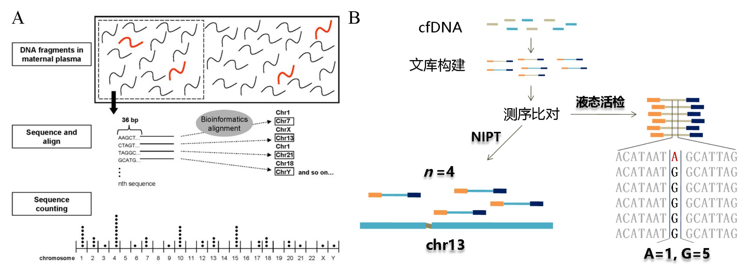 在过去的十年间,二代测序仪制造商Illumina战胜各路豪强,目前已占据了大部分市场份额。现在,购置一台Illumina最新款测序仪Novaseq,俨然和当年拥有苹果手机一样,是企业身份的象征。然而,Illumina的二代测序仪目前也面临着一些问题,例如文库富集以及测序仪的簇生成过程都是由PCR完成,会出现基因组覆盖不均匀的测序噪音;此外,依赖聚合酶的边合成边测序难以保证碱基准确性,将产生碱基错误的测序噪音。因此,在下游应用过程中,降噪技术显得尤为重要。 在2015年的CSCO大会上,贝瑞和康推出了自主研发的游离DNA富集技术,环化单分子扩增和重测序技术(Circulating Single-Molecule Amplification and Resequencing Technology,以下称为cSMART);该技术不单适用于无创单基因遗传病检测,更重要的是,cSMART技术特性满足液态活检高灵敏高特异性的要求,在肿瘤辅助诊断、用药指导、进展监测等临床领域均有广阔的应用前景。此外,2016年的CSCO大会,安可济公司推出自主研发的“Firefly™”游离DNA靶向测序技术,采用单链环化DNA滚环复制串联重复确认法,凭借全球领先的技术性能,在肿瘤个体化诊疗中取得了令人瞩目的成绩(6)。据安可济创始人林盛榕博士介绍,将这项技术命名为“Firefly”是因为萤火虫巧妙暗喻了该检测技术的降噪特性:相比白天(降噪前),夜晚(降噪后)的萤火虫才格外醒目。 基于NGS平台,从NIPT到液态活检其噪音源是什么,如何降低?另外我们注意到,领军企业贝瑞和康和行业新贵安可济都不约而同地提到了“环化”这个概念,环化到底有何优势? 接下来,我们围绕二代测序的两大临床应用,NIPT和液态活检技术中如何降低测序噪音的问题,和大家一起分享如何突破测序仪本身的技术限制,开创崭新的基因检测时代。在阐述这些问题之前,先简单介绍一下NIPT和液态活检的检测原理。 都是靠数数,怎样才记作1次? NIPT的检测原理是对怀孕母亲血液中的cfDNA进行高通量测序,通过统计测序Reads比对到染色体的次数来推测cffDNA(胎儿游离DNA,cell-free fetal DNA)的异常(图1A),以此预测胎儿染色体数目是否正常;换句话说,NIPT的基本原理就是数数。如图1B所示,在NIPT检测中,比对到基因组某条染色体的一整条Read算是1次。同样,液态活检也是靠数数来推测某条cfDNA是不是ctDNA,只不过检测分辨率从NIPT的染色体提升至单分子的单碱基水平,也就是大家常常听到的低频突变检测;所以,液态活检对碱基准确性提出了更高要求,必须降低测序错误噪音。 图1:NIPT和液态活检的检测原理(图1A节选自[1]) 降噪方案 NIPT通过检测cfDNA来间接评估胎儿基因状态,而通过羊水穿刺样本可以直接检测胎儿DNA反映胎儿基因的真实状态;液态活检通过检测血液中的ctDNA间接反映患者的肿瘤基因组变异,而使用组织样本则可以直接对肿瘤组织中的突变信息进行解读。相比“直接”的检测手段,这些“间接”的方法更容易受到干扰,我们将一切干扰正确判断的因素都称为噪音源,包括上面提到的Illumina平台仪器产生的噪音。