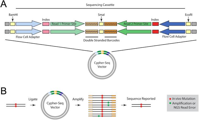 区分ctDNA多以单碱基突变为特征,他们在总cfDNA的含量较低,当测序错误率与ctDNA在cfDNA中占比相当时,比如都是0.1%,在这种情况下,我们无法判断观测到的某个突变是测序错误还是真实存在,ctDNA特有的标记便被淹没在错误噪音中(图2B)。 打个比方,某个坏人躲在人群中,他有两个特点,一是身高一米七,二是蓝眼睛,但是警力有限,只能重点排查,靶向捕获就是先把一米七左右的人找出来,然而我们发现很多一米七的人居然也是蓝眼睛,究其原因可能一些普通人带着蓝色的隐形眼镜,得先把隐形眼镜摘掉才能进一步判断,这里说到的蓝色隐形眼镜就是液态活检的噪音。 图3:液态活检流程中产生的背景噪音 利用二代测序进行液态活检的检测流程也可理解为一种靶向测序技术,通常我们指的靶向测序是对某个感兴趣的基因组区间进行特异检测,比如外显子靶向测序;只是在液态活检中,靶向的基因在肿瘤诊治中具有临床意义,比如靶向用药指导、肿瘤复发监控等。 如图3所示,液态活检技术流程中的噪音源可以细分为三个部分,第一部分来自于靶向捕获技术,也就是在召集身高一米七的人的过程中;第二部分是在文库扩增富集时由PCR聚合酶产生;最后就是测序仪本身的测序错误。前两种噪音属于文库构建层面,可以通过技术优化降低,测序仪的错误是基本固定的,最后,残留的噪音可以通过单分子标记技术进行矫正。下面我们先介绍一下前两种噪音如何产生以及优化思路。 首先,先谈谈靶向富集技术,现在的主流方法有两种,扩增子(PCR)和杂交捕获(图4A),杂交捕获存在两个明显的弊端,1) 实验操作比较繁琐,流程较长,不符合短周期样本的临床检测需求;2)探针杂交过程会对DNA造成损伤,导至碱基突变,噪音升高(图4B)。扩增子技术无探针杂交过程,不会产生额外噪音,操作简单,流程便捷;因此,常被液态活检采用。 图4:A. 两种常见的靶向捕获技术;B. 探针杂交过程产生的背景噪音(节选自[2]) 不过,扩增子技术并不是没有缺点,它靶向检测区域较小,特别是传统扩增子技术存在cfDNA模板丢失的问题,痕量的ctDNA可能趁机溜走。如图5A所示,cfDNA长度~170bp,不能同时被两侧引物覆盖的cfDNA就损失了。 图5:A.双侧引物扩增富集示意图;B. 单侧富集技术之成环;C. 单侧富集技术之锚定PCR 那么,工程师,你看怎么办?工程师:单侧引物富集。之所以说现代分子生物学的技术储备是二代测序得以蓬勃发展的土壤就是这个原因,测序前的样本处理过程,是一个完全开放的平台,研究人员可以运用人类所有的分子技术成果来达成研究目的。 单侧引物富集可以通过两种思路完成,第一,锚定PCR。如图5C所示,在PCR之前,在DNA分子的两端连接上已知序列,这样,即使cfDNA只含有单侧引物的结合位点,也可以与事先连接上的已知序列引物配对,进行PCR富集。第二,先成环再富集(图5B)。与锚定PCR一样,cfDNA分子内成环后,同样可以使用单侧引物富集文库。 如图6所示,我们看到了熟悉的质粒,有没有感觉场景突然被拉回到超净台,不过,这是一种基于克隆构建成环的二代测序技术,称为Cypher-Seq,2015年发表在Nucleic Acids Research杂志,在Cypher-Seq技术中,Illumina接头被制备成了载体,插入片段是待研究的目的DNA,可检测频率低至2.4x10-7的突变。 图6:低频突变检测技术Cypher-Seq流程示意图[3] 我们注意到上述方法是通过双链进行成环,双链成环有一个弊端,就是分子间的串联现象会比较严重,影响底物利用效率,因此,研究人员往往会选择特异性更强的单链分子内部成环(图7A)。 图7:A. 单链成环具有更强的特异性;B. 两种增强单链连接效率的方法 然而,特异性提高了,单链成环的效率却降低了,主要是因为单链DNA的连接效率是显著低于双链DNA的,所以,解决时就会用到一种伟大的思想,叫“没有机会,那就创造机会”,没有双链,人为制造双链结构。如图7B所示,在2013年,Nature Protocol报道了一种单链DNA连接建库的方法(ssDNA 1.0),该方法通过延长连接时间(过夜)来增加效率,流程非常耗时(4);2017年,Nucleic Acids Research公布了该流程的升级版本,在ssDNA2.0中,研究人员将单链接头改造为部分双链,在底物与接头的单链部分退火后,就获得了期望的双链结构,这时候T4 DNA连接酶的工作效率就非常高了,连接时间被压缩到1小时(5);此外,像Padlock技术一样,加入一段与单链分子互补配对的序列形成双链结构,连接效率也能够得到极大提升,类似的原理都可以用于提高单链连接效率。上面谈到的锚定PCR和成环技术,都是为了提高模板利用率,防止微量的ctDNA在此过程中丢失。 图8:A:传统指数PCR扩增;B:线性纵向扩增;C:线性横向串联扩增 下面,接着介绍噪音来源的第二部分,文库富集过程中,由聚合酶产生的碱基突变。文库富集有两种方法,一是指数扩增,二是线性富集。如图8A所示,指数扩增时,引物会以新合成的DNA为模板进行下一轮二链合成,所以某次突变会积累下去;而线性富集始终保持以原始DNA为模板,某次合成出现的突变不会继承传递(图8B);所以,借助线性扩增,聚合酶的合成错误不会因为指数扩增而被无限放大。 线性扩增又可分为横向和纵向两种,如图8C所示,横向线性扩增以成环的DNA为模板,利用聚合酶强烈的链置换活性(比如phi29、Bst DNA聚合酶等),不停的剥离上一轮合成所产生的二链,得到了横向串联重复的线性模板,横向与纵向线性扩增方式一样,均具有背景突变不会积累的优势(图8C)。phi29聚合酶保