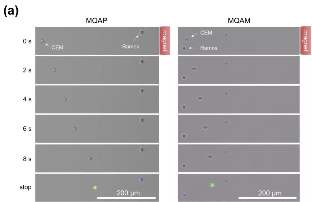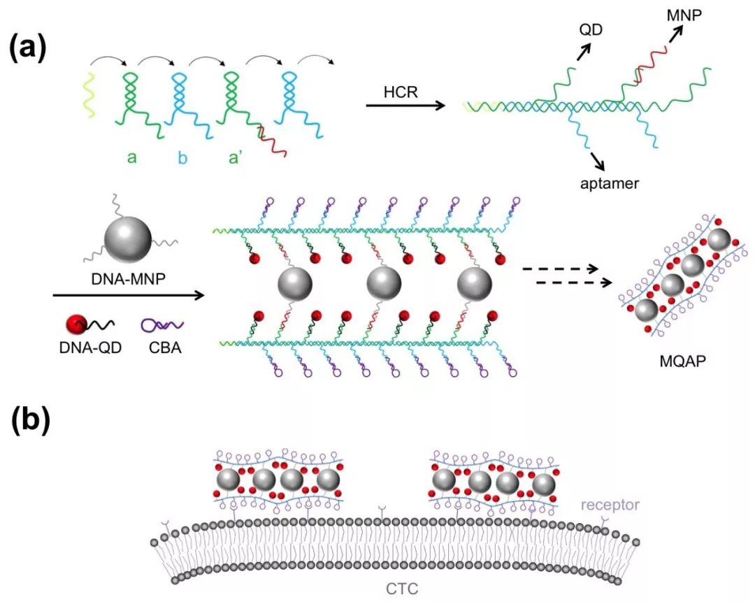 循环肿瘤细胞(CTC)在肿瘤转移中扮演着重要的角色,是导至癌症患者死亡的主要元凶之一。CTC检测对癌症早期诊断、预后判断以及治疗效果评估均具有重要意义。而CTC在外周血中含量极低,如何在数目众多的血细胞中对微量的CTC进行准确检测和计数是目前存在的一项技术难题。商业化的Cell Search系统是美国食品药品监督管理局(FDA)批准的唯一一套CTC检测系统,它利用免疫纳米磁珠对血液中CTC进行检测。这套系统虽能实现较高的捕获效率,但CTC捕获纯度却很低(<1%),大量的背景血细胞严重干扰了检测灵敏度和检测效率。 苏州大学马楠教授课题组发展了一类新型的量子点-磁颗粒-适配体共聚物,用于CTC的超灵敏捕获和检测。对CTC的捕获效率和捕获纯度达到了~80%,并可同步实现CTC单细胞成像。该聚合物是以DNA分子为模板将具有超顺磁性质的磁纳米颗粒、具有优异荧光性质的量子点纳米颗粒以及能够特异性识别肿瘤细胞的DNA适配体组装在一起(图一、图二)。通过DNA的聚合作用将磁颗粒的磁响应性和量子点的荧光光强同步放大;同时通过与细胞表面的多价键靶向作用大幅提高对肿瘤细胞的选择性。 图一、以DNA分子为模板构建量子点-磁颗粒-适配体共聚物以及该聚合物与肿瘤细胞表面受体的结合示意图 图二、 量子点-磁颗粒-适配体共聚物的透射电镜图 研究表明该聚合物可特异识别癌细胞,而与背景细胞的非特异性吸附可忽略不计。与量子点-磁颗粒-适配体组装单体相比该聚合物与癌细胞的结合力和选择性更强(图三),且提供了更高的荧光信号和磁响应性(图四)。 图三、量子点-磁颗粒-适配体共聚物(MQAP)和组装单体(MQAM)与目标癌细胞(CEM)和背景细胞(Ramos)相互作用的荧光图片 图四、量子点-磁颗粒-适配体共聚物(MQAP)和组装单体(MQAM)标记的癌细胞(CEM)在磁场作用下的运动情况。 进一步研究表明此类共聚物可以用于人血中微量CTC细胞的高效捕获和检测(图五)。在含有200个CTC/毫升的血液样品中其对CTC的捕获效率达到了78%,而捕获纯度达到了84%。通过量子点的高强度荧光信号对捕获的CTC细胞进行同步检测,同时保存了细胞的活性,可用于进一步分析。这与传统的三步检测法(细胞分离-细胞固定-细胞成像)相比又是一项改进。 图五、在磁场作用下对共聚物处理的血液样品中CTC细胞的捕获和成像。