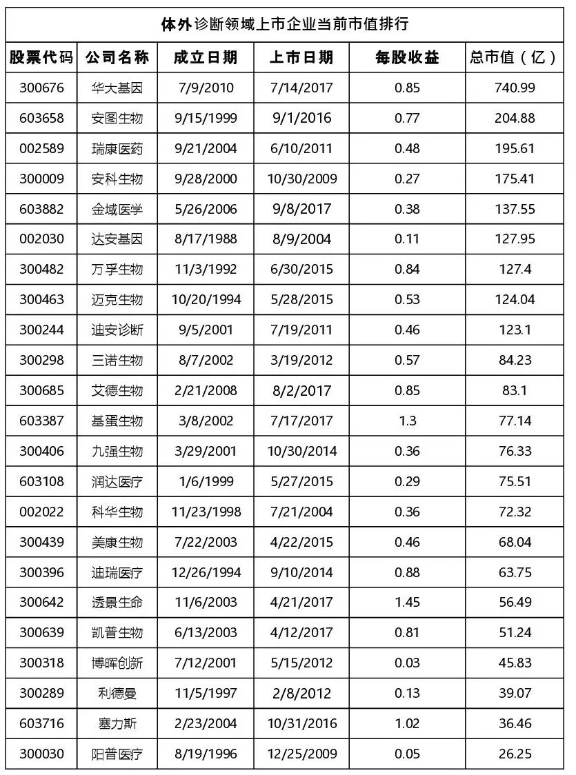 中国体外诊断产业起步于20世纪80年代,而体外诊断这一词的出现则是在20世纪90年代末。经过30多年来体外诊断产业人的不断开拓和进取,我国的体外诊断产业取得了巨大的进步。本行业某些领域一直都是资本竞相追逐的对象,新年伊始,小编为大家汇总了最新的业内23家上市公司的数据排行,希望我们的企业在变革中不断加强自身建设,通过技术创新发挥各自的优势和作用,祝大家在新的一年里乘风破浪,再创辉煌! (截止年初发稿) 本行业总市值排名TOP3: 总市值排名前三位的分别是华大基因(740.99亿)、安图生物(204.88亿)、瑞康医药(195.61亿)。 每股收益排名TOP3: 每股收益前三只股票分别是透景生命(1.45)、基蛋生物(1.3)、塞力斯(1.02)。 数据来源: 证券投资具有一定风险,根据《中华人民共和国信托法》、《信托公司集合资金信托计划管理办法》及其他相关法律法规的有关规定,参与信托计划的人士应为风险识别、评估、承受能力较强的合格投资者。请确认您或您所代表的机构是一名“合格投资者”,并将遵守适用的有关法规。 本网站所载的各种信息和数据等仅供参考,并不构成销售要约,或买入任何证券、基金或其它投资工具的建议。投资者应仔细审阅相关金融产品的合同文件等以了解其风险因素,或寻求专业的投资顾问的建议。信托计划不承诺保本和最低收益,具有一定的投资风险。投资者的本金可能会因市场变动而蒙受损失,请投资者充分认识投资风险,谨慎投资。 投资者不应依赖本网站所提供的数据做出投资决策,否则由投资者自行承担所有风险。 |