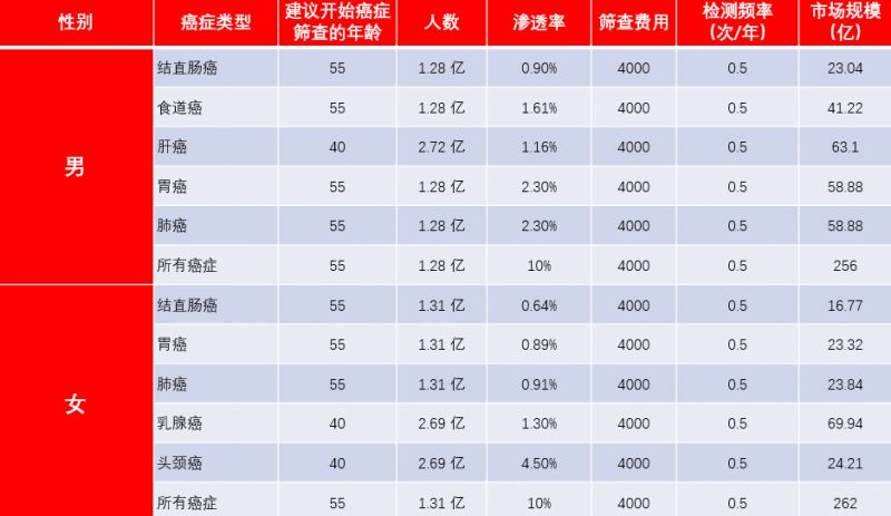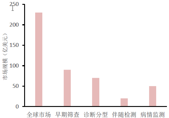 液体活检技术的出现,弥补了上述的一些缺点。肿瘤的监测、用药评估等方面,液体活检技术大大提高了检测时效性和准确性,在一定程度上减轻了肿瘤患者的“检查之痛”。 二、液体活检是什么 液体活检技术,实质上是体外诊断中的分子诊断技术,在样本来源上的延伸(从组织延伸至血液、体液、外泌体等,临床更多采用血液),通过检测肿瘤或转移灶释放到血液循环中的肿瘤细胞(CTC)和肿瘤DNA(ctDNA)碎片,早期筛查、检测肿瘤,或评估药物疗效等。由于其非侵入式取样特性,是检测肿瘤、辅助治疗的突破性技术,是“精准医疗”代表性的诊断技术。 表1 肿瘤标志物检测和液体活检的区别 三、 液体活检的应用方向 液体活检技术可应用于肿瘤的早期筛查、检测、用药指导、评估、观察,贯穿癌症诊治全程,同样是液体活检技术的核心优势之一。 1.肿瘤筛查:当肿瘤生长到一定阶段,会向血液循环释放肿瘤细胞(CTC)或者肿瘤DNA(ctDNA,CTC和ctDNA将在后续文章中详细介绍),通过检测它们有助于筛查肿瘤。 2.肿瘤分期分级:循环系统是肿瘤转移的重要途径,如果将外周血CTC计数和染色作为临床分期的参考条件,可增进对肿瘤分期的理解,有利于医生制定肿瘤治疗方案。另一方面,在癌症突变的不同阶段,CTC含量和ctDNA突变情况都可能会不同,有助于医生判断病人的肿瘤进展。 3.预后评估:癌症患者接受治疗有效,CTC数量将会相应减少;疗效欠佳,CTC数量变化很小。因此血液CTC含量变化可以帮助判断治疗效果,了解病人耐药情况和疾病进展,进一步调整治疗方案。 4.精准用药(个体化治疗):同一种癌症,突变仍然可能不同,对不同药物反应各异。FDA目前已经批准了大量根据肿瘤基因型突变的癌症个性化用药指导方针。传统上利用肿瘤组织活检或手术取得的组织标本检测肿瘤基因突变。目前研究表明,ctDNA突变与肿瘤组织突变具有高度相似性,分析血液ctDNA可以帮助医生判断病人肿瘤的突变类型,制定用药方案。 5.耐药监控:肿瘤患者接受一段时间化疗治疗后,相当一部分会出现耐药。过去只能在化疗随诊时才能回顾性评价,且传统组织活检只能检测肿瘤组织局部区域,不能反应肿瘤的动态变化。近年来,越来越多研究表明,检测患者外周血ctDNA突变类型的变化,可能是实时监测肿瘤药物耐药一种非常有效的方法。 6.肿瘤转移、复发:肿瘤转移和复发是肿瘤致死的主要原因,多数肿瘤若能早期检测到转移、复发,患者还有较大的治疗机会。但传统影像学检测对肿瘤转移和复发的早期预警灵敏度和及时性尚有不足。癌症复发早期,血液CTC、ctDNA即增加。 1.全球市场规模预测 图2 国际液体活检全球市场规模(亿美元) 资料来源:GoldmenSachs Report,浙商证券研究所 高盛将液体活检分为早期筛查、诊断分型、伴随检测和病情监测四个领域,预计全球市场潜力可达230亿美元,并预测市场需要5-15年才能快速发展并成熟。 2.中国市场规模预测 图3 中国液体活检癌症早期筛查市场规模预测 资料来源:GoldmenSachs Report,浙商证券研究所 预计未来癌症早期筛查市场规模约在518亿元人民币,其中男性肝癌、胃癌和肺癌未来市场空间较大,而女性乳腺癌由于发病年龄早,发病率高,是未来癌症早期筛查市场空间最大的瘤种。 结合目前液体活检发展的势头来看,虽然液体活检在癌症治疗市场份额相对较小,但对肿瘤患者而言是“刚需”。预计未来2-5年内,这部分市场会率先开始发展。早期筛查市场虽然空间大,但是目前技术尚未达到临床需求,而且价格高,客户接受程度低,推广困难。技术突破和成本降低是肿瘤早期筛查市场的催化剂。 最后,强调两点内容: 1.液体活检尚不能用于肿瘤早筛。早筛是指对肿瘤的预测,以及早期肿瘤的检查。因为只有当肿瘤生长到一定阶段后,CTC或者ctDNA进入血液,才能通过液体活检的方式检测出来。而此时,肿瘤往往已经生长到一定规模,不再是早期肿瘤了。 2.液体活检技术不是传统检查的替代技术。肿瘤的初步诊断、确诊和疗效评估,应该根据实际情况,结合影像、肿瘤标志物和液体活检等检查方式综合判断。液体活检在一定程度上解决了传统技术的部分局限性,但尚不足以替代传统检测技术。 来源: 莫罗单抗丨作者:Craig,Klaith |