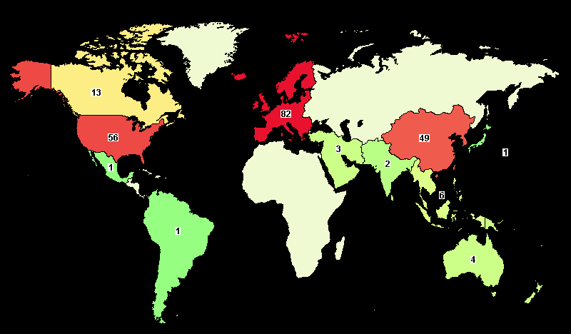 资料来源:ClinicalTrails 2.ctDNA检测的临床研究统计 截至2018年4月13日,全球共有ctDNA检测相关研究212项,其中美国56项,中国30项。地区分布如下: 图4 全球ctDNA检测研究分布