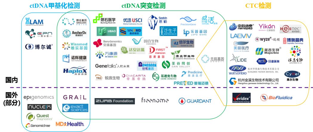 液体活检的样本来源 资料来源:N Engl J Med 2018;379:1754-65,宽华投研团队整理 1.3 检测标志物有多种,但ctDNA是目前市场上最常见的形式 外周血液中可以被检测的分析物(analyte)包括循环肿瘤细胞(CTCs);循环无细胞DNA(cfDNA),在癌症患者中它包含循环肿瘤DNA(ctDNA)。其它分析物包括循环无细胞RNA(cfRNA);细胞外囊泡(EVs),例如外泌体和肿瘤“教育”的血小板(TEPs);蛋白质和代谢产物。这些分析物有潜力提供关于原发瘤和转移灶特征的信息。目前,市场上的液体活检公司主要集中于研发CTC和ctDNA,但ctDNA公司在融资和营收方面的表现都要优于CTC公司。与CTC相比,ctDNA的丰度较高,1 ml肿瘤患者血液中含有成千上百个基因组当量的DNA片段,而CTC数量少于10个。此外,ctDNA技术手段较为成熟且临床应用最为广泛,尤其是可能应用于癌症的早期诊断。由于巨大的临床潜力,ctDNA当前已成为市场上最常见的液体活检形式,。
