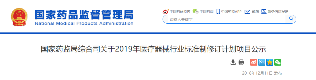 按照《医疗器械标准管理办法》《医疗器械标准制修订工作管理规范》要求,国家药品监督管理局组织开展了2019年医疗器械行业标准制修订项目遴选工作,经公开征求意见和组织专家论证,确定了2019年94项医疗器械行业标准制修订计划项目,现予以公示。公示期间,如对计划项目有异议,请向国家药品监督管理局反馈。 公示时间:2018年12月11日至12月17日 联系人及电话:黄伦亮,010-88331421 通讯地址:北京市西城区宣武门西大街26号院2号楼国家药品监督管理局器械注册司 邮编:100053