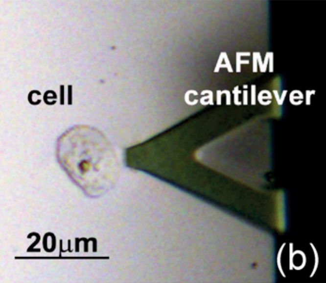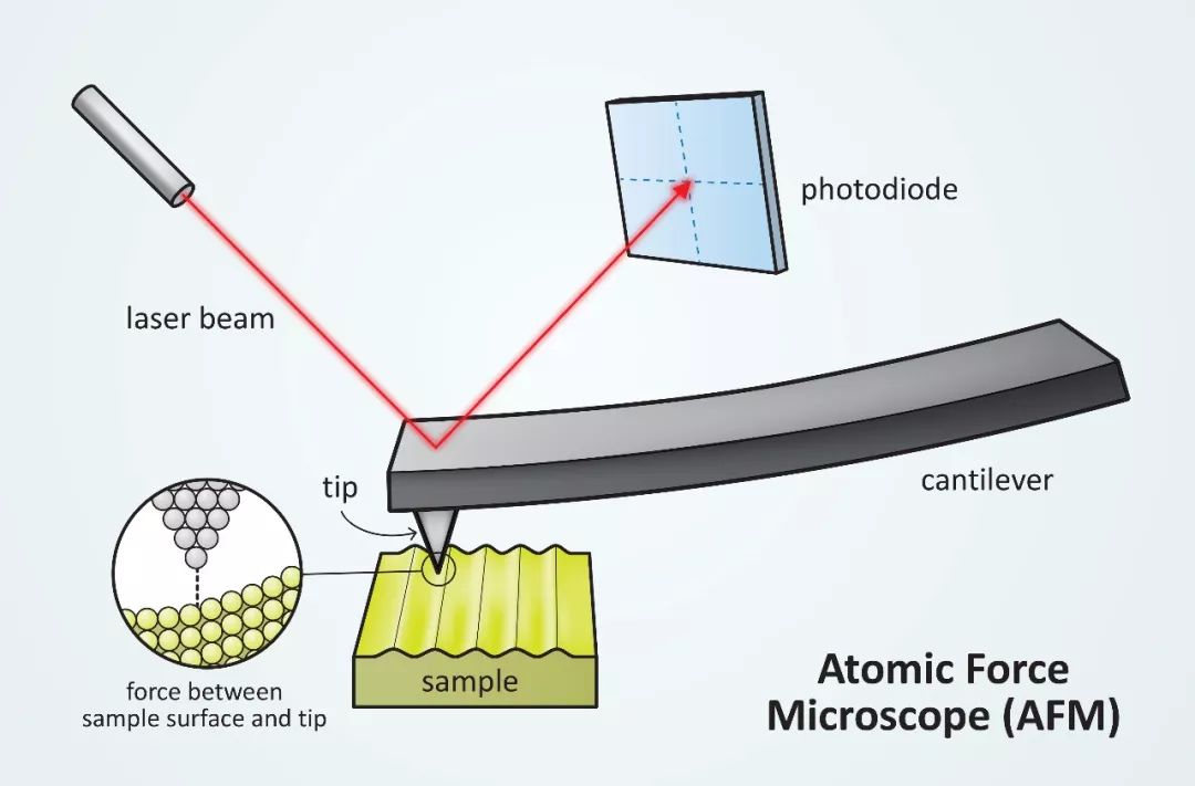 这项技术就是基于原子力显微镜的影像学诊断技术!原子力显微镜通过微悬梁臂上的探针对细胞的表面进行“描绘”,探针在经过凹凸不平的细胞表面时会发生不同程度的微小偏移,记录下这种偏移后,研究人员就能够描绘出细胞表面的纳米级特征图谱。此外,探针的“摆动”还能够检测出样本的一些物理学特征,比如细胞的粘附力等等。 近年来原子力显微镜已成为微小生物结构不可缺乏的探测工具。主要原因是因为电子显微镜必须在真空环境下操作,而生物体离不开体液也不能在真空中存活。所以,对于生物体的纳米级观测,原子力显微镜成为唯一工具。原子力显微镜不仅可针对生物样品表面撷取影像,也可以探测生物体内的纳米级力学性质(比如实验探测DNA的拉伸强度值)。 原子力显微镜的基本架构图,主体结构为一个微悬臂梁,悬臂梁的自由端设有一探针。探针尖端的曲率半径约数个纳米,它与试体间存在分子间作用力。以低功率激光照射在探针背面,其反射讯号投影在光感测器,藉由光感测器上光点的位置探知微悬臂梁的振动情况。