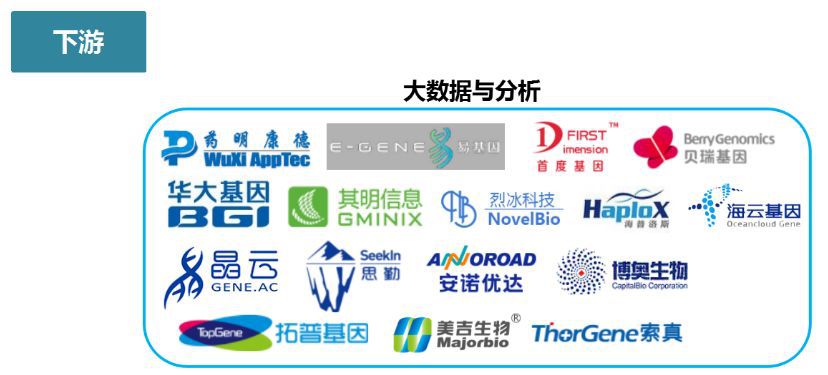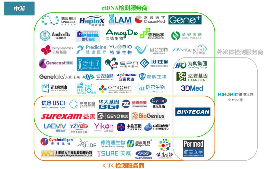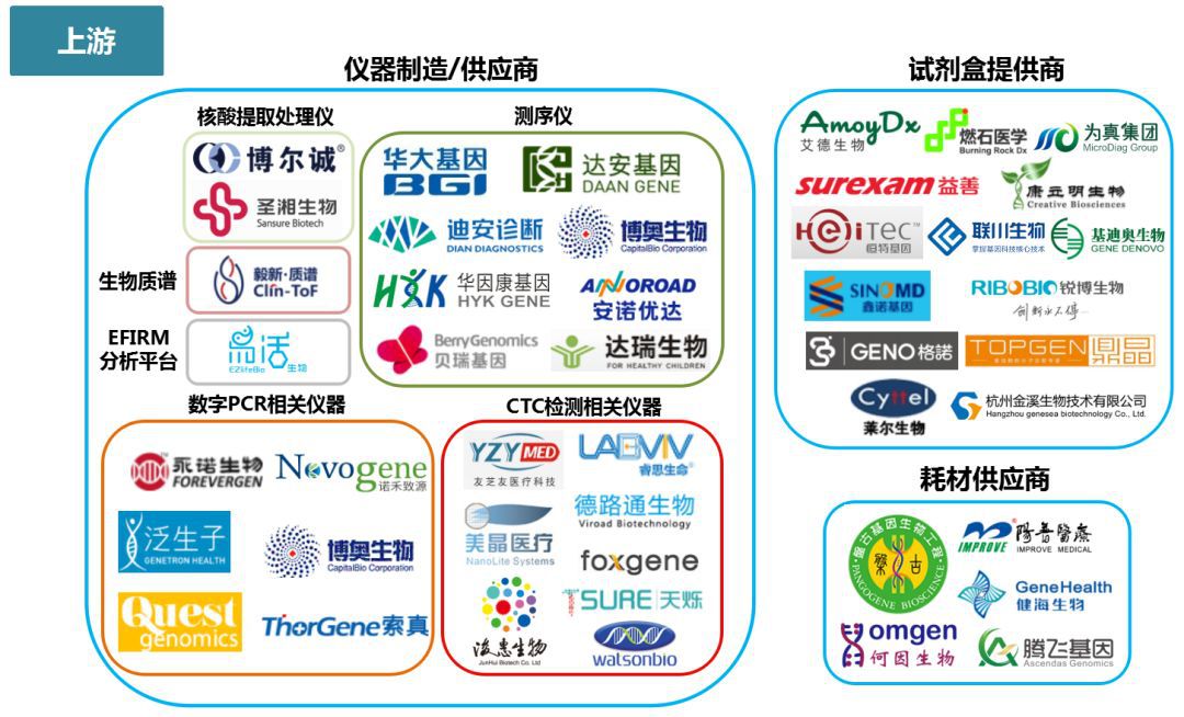 液体活检全产业链包括上游的仪器、试剂盒和耗材供应商,中游的液体活检检测服务商以及下游的大数据与分析公司。