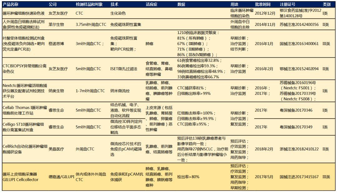 除了ctDNA,也有多款与CTC检测有关的国内产品获批上市。在2012年和2014年CFDA先后批准了武汉友芝友医疗的循环肿瘤细胞快速染色液(鄂汉食药监械(准)字2012第1400128号)和北京莱尔生物的人外周血白细胞去除试剂盒(苏械注准20142400356)两个CTC相关产品,分别属于一类和二类医疗器械。前者主要采用生化手段对CTC进行染色分析,后者则通过CD45等标记去除人外周血中的白细胞,以便对CTC进行分离鉴定。