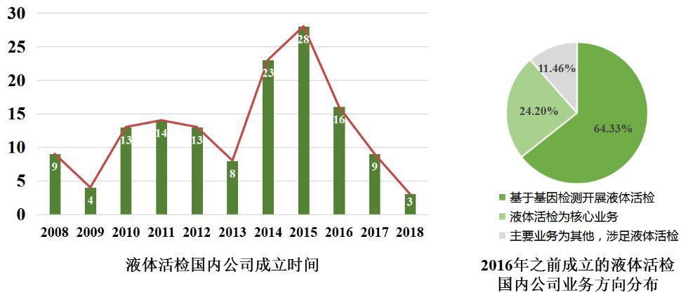 液体活检作为精准医疗的一项新技术,其公司成立时间的发展趋势与基因检测行业基本一致。国内布局液体活检的公司数量在2010年之后随着时间线一路增长,并在2015年出现峰值,近两年下降趋势明显。2010年之前每年新成立的公司数量平均不到3家,大都为1-2家,2008年例外(达到9家,可能与Illumina于2007年推出二代测序平台有关)。2010-2012年前后,随着基因检测技术的发展,又有一批公司相继成立。 2014年开始,国内基因行业创业潮爆发,2015年液体活检被《麻省理工大学科技评论》纳入“2015年度十大突破技术”,同年美国和中国启动了精准医疗计划。这样的背景下,更多涉及液体活检的公司成立,仅2014到2016年就有71家新公司成立。然而,无论是早期设立的,还是2015年左右成立的公司,多数是在2015年左右才开始涉足液体活检业务,将其作为主营业务的公司占比为22.07%。近两年新成立的公司数量明显减少,这些公司成立之初大都将液体活检作为核心业务,如求臻医学、恺尔生物、奥明基因、中鑫基因、天烁生物、思勤医疗等。