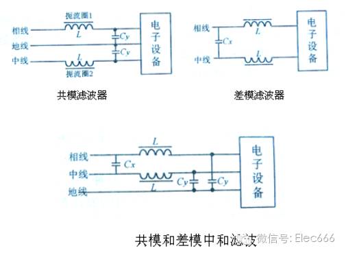 实际上,在电源线中往往同时存在共模和差模干扰,因此实用的电源滤波器是由共模滤波电路和差模滤波电路综合构成,如图所示: