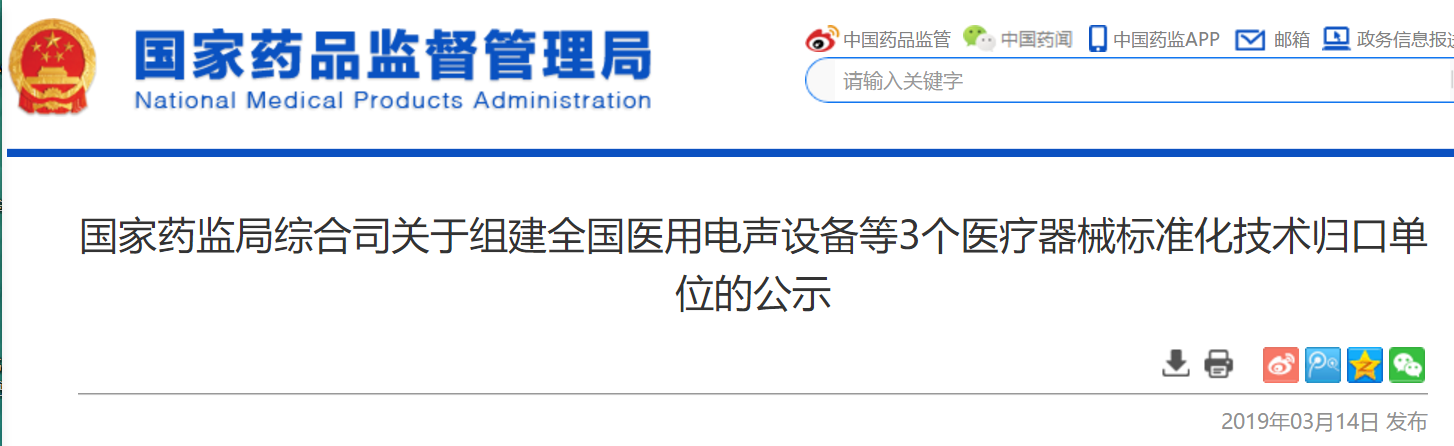 为适应医疗器械产业发展需求,结合监管工作实际,经研究,国家药监局拟成立全国医用电声设备等3个医疗器械标准化技术归口单位(组建方案见附件),现予以公示。公示期间,如对医疗器械标准化技术归口单位组建方案有异议,请向国家药监局器械注册司反馈。 公示时间:2019年3月13日至4月12日 电子邮箱:mdct@nmpa.gov.cn 联系电话:010-88330608 附件:1.医用电声设备标准化技术归口单位组建方案 2.医用增材制造技术医疗器械标准化技术归口单位组建方案 3.人工智能医疗器械标准化技术归口单位组建方案 国家药监局综合司 2019年3月12日 关于组建全国医用电声设备等3个医疗器械标准化技术归口单位的公示附件1.doc