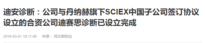 三月,有着“并购之王”之称的丹纳赫,在中国区动作连连! 第一,对中国诊断、生命科学管理架构进行大调整。丹纳赫中国生命科学和诊断业务将转向以平台为主导的模式,每个平台都任命了一位中国区平台总裁,其中任命Jason Peng为中国区诊断平台总裁,向丹纳赫诊断平台执行副总裁 Dan Daniel 汇报,这样的架构可能对其诊断业务产生深远影响。第二,被爆出与国内“老大哥”迪安诊断合作的迪赛思诊断,不少产品已经取得注册证,并已经开始生产和销售。SCIEX作为全球优秀仪器跨国公司丹纳赫集团的一员,成立于1973 年,拥有超过 40 年的发展历史及创新经验,是全球领先的质谱仪器厂商,曾推出世界上首台商用化三重四级杆质谱仪器产品。 国内医检巨头牵手丹纳赫我们捋一下时间线。 2017年11月11日,丹纳赫生命科学平台SCIEX公司宣布与浙江迪安诊断公司共同组建一家合资企业。这个合资公司——迪赛思诊断的建设进度及投产时间也就成了IVD人关心的话题。 2018年,年初开始选址; 2018年5月,完成厂房设计工作,完成招标工作并开工建设; 2018年9月,GMP厂房整体建设完工,并于9月17日开始试生产; 2018年底,25-羟基维生素D萃取液(衍生化法)的注册证以及血甲氧基肾上腺素萃取液已经取得注册证,并已经开始生产和销售,目前正在逐步规模化经营推进过程中。 丹纳赫为什么选择了迪安诊断? 丹纳赫集团是位于美国的全球知名公司,它为何选择与国内IVD巨头迪安诊断合作? 一方面是出于自身忧患意识。2018这一年,丹纳赫被雅培赶超,屈居全球IVD第三,源于雅培由于收购Alere,丹纳赫当然不能坐以待毙,是以2019开年就收购了GE部分业务。这也暴露出了即使在巨头间,也是你争我赶。