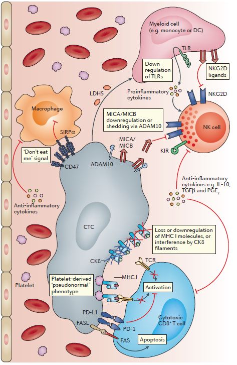 普恩检验ChimeraX® CTC 检测 在临床样本中检测到E+ CTC、M+ CTC及M+ CTM 进入血液中的CTC只有极少数(~1%)能存活下来,它们是如何躲过血液中免疫细胞的追捕呢? 外周循环系统对于CTC来说是一个充满“敌意”的环境,因为当CTC离开免疫抑制的肿瘤微环境进入外周循环系统之后,它就暴露在活跃的免疫监视之下,同时面对着大量的免疫细胞。理论上来说,此时的CTC更容易被肿瘤特异性免疫细胞清除。然而研究发现,CTC可以通过一些特殊的方式,走上它的“免疫逃亡”之路。 外周血中CTC的免疫逃逸机制 经典的MHC分子和NK细胞配体机制 MHC I类分子在适应性免疫中起重要的抗原提呈作用。干扰MHC分子介导的抗原提呈是免疫逃逸的关键途径。肿瘤细胞可以通过简单的下调表达或不表达MHC I 类分子来避免死亡,但是当MHC I类分子表达异常时,作为“后备力量”的NK细胞就会活化。因此,CTC必须进化出新的免疫逃逸方法——既表达MHC I类分子又不进行肿瘤相关抗原的呈递。研究表明,肿瘤细胞可以将来源于正常血小板的含有MHC I 类分子的囊泡整合进自己的细胞膜,从而获得“伪正常”表型,逃逸NK细胞介导的免疫反应。 此外,肿瘤细胞还可以通过过表达细胞角蛋白8(CK8)及其异二聚体成员(CK18/CK19),抑制MHC I类分子与CD8+杀伤性淋巴细胞的相互作用。 NK细胞可通过其表面的NK细胞受体D(NKG2D)与肿瘤细胞表面的MHC I多肽相关序列A(MICA)/MICB结合,从而介导对肿瘤细胞毒性。然而,肿瘤细胞可以通过下调MICA/MICB或NKG2D的表达,来逃逸NK细胞介导的细胞毒性作用。 非经典MHC分子机制 在编码非经典MHC I类分子的基因中,HLA-G基因与肿瘤侵袭、免疫逃逸及转移的关系最为显著。研究发现,HLA-G基因在黑色素瘤、胶质瘤、结直肠癌、肝癌、乳腺癌、肺癌和卵巢癌等多种肿瘤中存在高表达。HLA-G蛋白通过与免疫细胞表面的多种受体结合,使肿瘤细胞逃逸NK细胞和T细胞介导的免疫反应。同时,肿瘤细胞分泌的可溶性HLA-G蛋白(sHLA G)也能调节抗肿瘤反应。研究表明,CTC可以利用细胞外囊泡的sHLA-G蛋白来逃避NK细胞介导的清除过程。 FAS/FASL介导的细胞凋亡机制 跨膜受体FAS可启动细胞凋亡。肿瘤细胞表达FASL,可能会积极诱导免疫细胞的凋亡;相反地,若肿瘤细胞表达FAS,则可能被表达FASL的免疫细胞清除。另外,肿瘤细胞还可能通过分泌可溶性的FAS而使其躲过FAS介导的细胞凋亡。因此,CTC可以通过调节FAS/FASL的表达进行免疫逃逸,但FAS/FASL的表达及其可溶性蛋白可以在多大程度上保护CTC不被免疫细胞清除,尚未完全清楚。 CD47介导的“不要吃我”机制 肿瘤细胞表面CD47蛋白与巨噬细胞和树突状细胞表面的配体信号调节蛋白α(SIRPα)结合,可以抑制由这类细胞引起的吞噬作用。CTC细胞可通过CD47表达上调来发出“不要吃我”的信号,从而实现免疫逃逸。 免疫检查点机制 通过抑制免疫检查点分子来释放抗肿瘤免疫反应中的“刹车”,一直是免疫治疗的主要研究方向。T细胞表面的PD-1受体,就是免疫反应中的“刹车”,其抑制T细胞的激活,是正常情况下免疫系统的自稳机制。肿瘤细胞利用这一点,通过表达PD-L1与T细胞表面的PD-1结合来转递抑制性信号,从而抑制免疫反应。此外,研究还发现了其他免疫抑制性受体,如CTLA-4和相关的B7家族成员、半乳糖凝集素-9以及淋巴细胞活化基因3(LAG3)。目前已在不同肿瘤的CTC中发现了PD-L1的异质性表达,其在肿瘤免疫逃逸中的作用有待进一步探索。 总之,在肿瘤微环境以外对抗和逃逸抗肿瘤免疫反应是肿瘤转移过程中的关键步骤。CTC作为肿瘤散播和转移的介导者,在肿瘤细胞与免疫细胞相互作用中扮演了重要的角色。为了在治疗中更好地靶向肿瘤及其CTC,我们需要对CTC逃逸免疫监视的机制进行更加深入的探索。我们相信,在CTC识别、捕获和分析等方面的技术革新将极大地推动这一领域的研究工作。 参考文献: [1] Circulating Tumor Cell Clustering Shapes DNA Methylation to Enable Metastasis Seeding.Cell. 2019 Jan 10;176(1-2):98-112. [2] Circulating breast tumor cells exhibit dynamic changes in epithelial and mesenchymal composition.Science. 2013 Feb 1;339(6119):580-4. [3] Epithelial-mesenchymal transitioned circulating tumor cells capture for detecting tumor progression.Clin Cancer Res. 2015 Feb 15;21(4):899-906. [4] Circulating and disseminated tumour cells – mechanisms of immune surveillance and escape. Nat Rev Clin Oncol. 2017 Mar;14(3):155-167. [5] Biology, detection, and clinical implications of circulating tumor cells. EMBO Mol Med. 2015 Jan;7(1):1-11. |