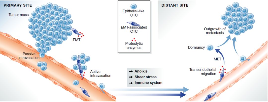 90%以上的癌症死亡与肿瘤转移有关,如何及时发现、并有效地抑制肿瘤转移一直以来都是医学界的重要课题。2019年Cell杂志第一期以封面文章的形式发表的一篇关于循环肿瘤细胞(CTC)的研究发现,在小鼠模型中,通过抑制CTC聚集成团,将肿瘤转移风险降低了80倍,实现不需要杀死肿瘤细胞即可有效控制癌症转移。该研究不仅开辟了一条新的癌症治疗思路,也再一次突显出CTC的临床应用价值。 CTC在被发现之初,就被扣上了肿瘤转移罪魁祸首的帽子。CTC是如何从原有肿瘤脱落,进入血液,并最终成功转移形成新的肿瘤呢?最近几年,随着CTC检测技术的不断进步,科学家们对于CTC导至肿瘤转移的机制的认识也不断深入。 目前为止,最具代表性的癌症转移理论就是肿瘤细胞的上皮-间质转化(EMT),为了从肿瘤原发灶脱离出来,部分肿瘤细胞会发生EMT,降低与周围其他肿瘤细胞的黏附力,并增加本身的迁移和侵袭能力。 肿瘤的转移过程 CTC的EMT过程已在很多临床研究中被证实, 科学家们在乳腺癌、肠癌、肝癌、胃癌等患者的外周血中,除了检测到上皮型CTC(E+ CTC)外,还发现存在一定比例的间质型CTC(M+ CTC)。顿慧医疗qixia普恩检验的ChimeraX® CTC 检测 在150例阳性(CTC≥1/5mL)样本中(包含了肝癌和胃癌临床样本),也发现了相近的CTC异质性,并且在多例样本中检测到了间质型CTC团(M+ CTM)。