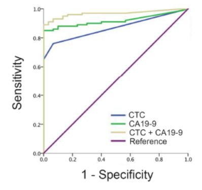 浙江大学医学院附属第一医院肝胆胰外科课题组最新研究结果显示:CSV阳性间质型CTC可以有效辅助胰腺癌化疗和手术疗效监测,同时可作为监测手术后胰腺癌疾病进展及患者预后评估的手段,该研究成果已经发表在Cancer Lett.杂志(影响因子6.491)。 本研究使用杭州华得森生物技术有限公司CytoSorter® 循环肿瘤细胞检测系统,结合基于细胞表面波形蛋白(Cell Surface Vimentin, CSV)的间质型CTC富集检测试剂,高效完成胰腺导管腺癌(PDAC)外周血CTC分选和鉴定。相较于上皮性肿瘤细胞标记物(EpCAM),基于细胞表面波形蛋白(CSV)的PDAC循环肿瘤细胞(CTC)富集检测效率更高。CytoSorter CSV CTC捕获系统对PDAC患者CTC的检出率可达76%(76/100),而CellSearch EpCAM CTC捕获系统在PDAC患者的检出率只有6-30%。 本研究以CTC数量2为阈值,CSV阳性间质型CTC在PDAC、良性胰腺癌(IPMN)及健康人的阳性率分别为65%﹑25%及0%,CSV阳性间质型CTC检测可明显地区分PDAC患者和健康人,这为CTC辅助胰腺癌早期筛查奠定了一定的液体活检基础。 CSV阳性间质型CTC在胰腺癌临床诊断上是个可靠的生物标志物。相对于CSV阳性间质型CTC未检出或只检出1颗的患者,CTC检出超过2颗的PDAC患者通常有较晚期的疾病。相对于局部病灶的PDAC患者,有转移性病灶的PDAC患者CSV阳性间质型CTC更多。16位PDAC患者在手术前后进行了CSV阳性间质型CTC检测,14位患者在术后皆有大幅度的CSV阳性间质型CTC数目降低。15位进行化疗的PDAC患者,有13位疾病好转,肿瘤缩小了,其中12位的CTC数目降低或维持不变;疾病进展的2位患者,其CSV阳性间质型CTC数目显著增加。 CSV阳性间质型CTC计数与可切除肿瘤PDAC患者的肿瘤负担变化相关。对化疗有反应的PDAV患者,在化疗后可观察到CSV阳性间质型CTC计数显著降低。术前有较多CSV阳性间质型CTC的患者有较短的无复发生存期。 另外,本研究还显示CSV阳性间质型CTC检测与CA 19-9检测的联合使用可大幅增加对PDAC患者的诊断效力 (AUC=0.968)。 本研究证实杭州华得森生物CytoSorter® 循环肿瘤细胞检测系统可以用于肿瘤临床诊断,CSV阳性间质型CTC检测对于胰腺癌患者化疗疗效和疾病进展监测,具有一定的临床诊断指导价值。CSV阳性间质型CTC的富集可让临床工作者更深入了解CTC在PDAC上的生物学和临床意义。 参考文献: Wei T, Zhang X, et al. Vimentin-positive circulating tumor cells as a biomarker for diagnosis and treatment monitoringin patients with pancreatic cancer[J]. Cancer Lett. 2019 Mar 21. pii: S0304-3835(19)30165-X. doi: 10.1016 中国CTC 产业联盟,是由国内10 家CTC 研发型企业共同发起,于2016年9月30日正式成立的行业联盟。联盟的宗旨是“促进CTC的学术交流,推动CTC的临床应用,建立CTC的行业标准”,为我国肿瘤患者以及癌症高危人群的慢病防治做出贡献。组成联盟的公司为北京博奥晶典生物技术有限公司、北京中科纳泰生物科技有限公司、杭州华得森生物技术有限公司、益善生物技术股份有限公司、珠海丽珠圣美医疗诊断技术有限公司、上海柏慧康生物科技有限公司、宜昌美光硅谷生命科技股份有限公司、广州安方生物科技有限公司。