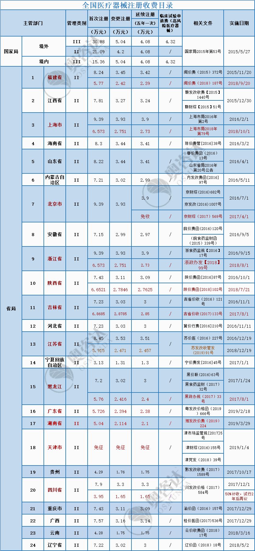 湖南省Ⅱ类医疗器械产品注册费下调,每个品种首次注册费为50400元,较之前降低21600元;变更注册费为21140元,较之前降低9060元;延续注册费为21000元,较之前降低9000元。 2019年4月11日,湖南省发展和改革委员会官网发布《关于发布湖南省市场监督管理系统行政事业性收费标准的通知》,通知对湖南省药品注册费、医疗器械产品注册费、特种设备检验费等收费标准进行了调整。其中Ⅱ类医疗器械产品注册费首次注册、变更注册和延续注册费用在原来收费标准基础上都有下调。 湖南省医疗器械行业协会在前期推动方面做了许多工作,向省发改委提交《关于请求减免我省Ⅱ类医疗器械注册收费标准的报告》、多次组织会员企业配合政府相关部门进行调研……医疗器械产品注册收费标准调整通知落地,对湖南省医疗器械相关企业来说是一个福音。 该通知自2019年4月10日起执行,有效期五年。同时,《湖南省发展和改革委员会湖南省财政厅关于重新发布全省食品药品监督管理部门行政事业性收费标准的暂行通知》(湘发改价费〔2017〕208号)、《湖南省发展和改革委员会 湖南省财政厅关于重新发布湖南省质量技术监督系统行政事业性收费标准的通知》(湘发改价费〔2014〕1039号)一律废止。 24省市注册收费标准列表大全 单位:万元 (点击查看大图) |