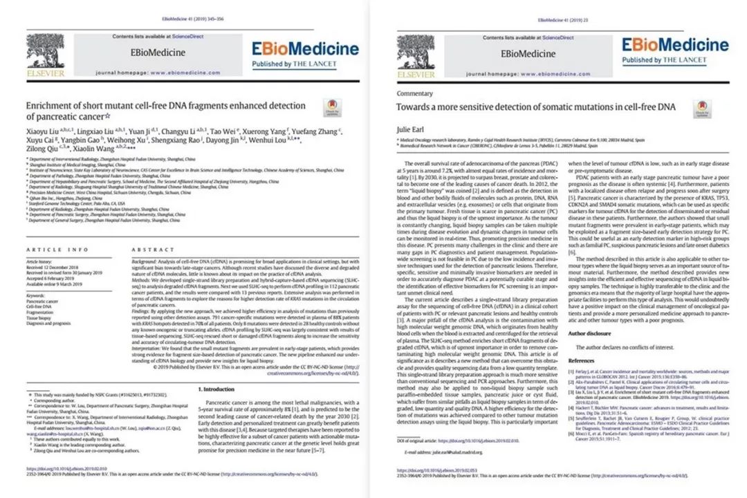 随着“精准医学”的概念被逐渐运用至肿瘤领域中,以游离DNA( cell-free DNA, cfDNA)检测为代表的“液体活检”技术正成为恶性肿瘤、产前诊断和器官移植排异监测的新兴标志物。 近日,复旦大学附属中山医院王小林教授研究团队在国际著名期刊Lancet杂志子刊EBioMedicine上发表了题为《通过富集短片段cfDNA提高胰腺癌的检出》(Enrichment of short mutant cell-free DNA fragments enhanced detection of pancreatic cance)的研究成果论文,提出了基于单链建库的cfDNA建库和测序方法,该方法较传统的二代测序和ddPCR技术,能使早期胰腺癌患者血液中的ras突变的检出率从不足50%提升至70%左右,显著提高了早期胰腺癌患者循环肿瘤DNA即ctDNA突变的检出率,以达到疾病的早期诊断和监测的目的。 由于早期肿瘤患者血液总体cfDNA水平较低,ctDNA检出较为困难,因此王小林团队的上述方法对胰腺癌等恶性肿瘤的早期诊断意义尤为重大。欧洲卡哈尔研究所液体活检专家Julie Earl教授为研究成果论文撰写了题为《提高cfDNA体细胞突变检测灵敏度》(Towards a more sensitive detection of somatic mutations in cell-free DNA)的述评,对王小林团队的研究进行了解析和高度评价。 据王小林教授介绍,胰腺癌是一种恶性程度极高的消化系统肿瘤,其发病率与死亡率几乎相当。早期诊断困难与缺乏有效的个体化治疗方案是导至胰腺癌预后极差的重要原因, 80%左右患者确诊时已发生肿瘤外周侵犯或远处转移,无法接受手术治疗。