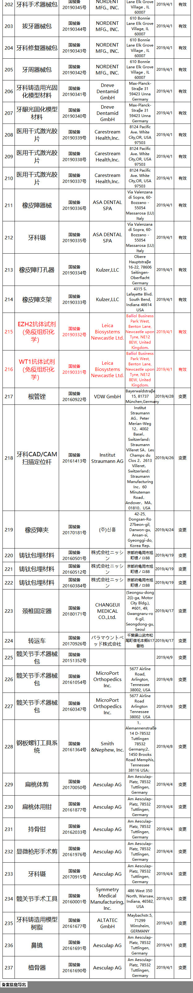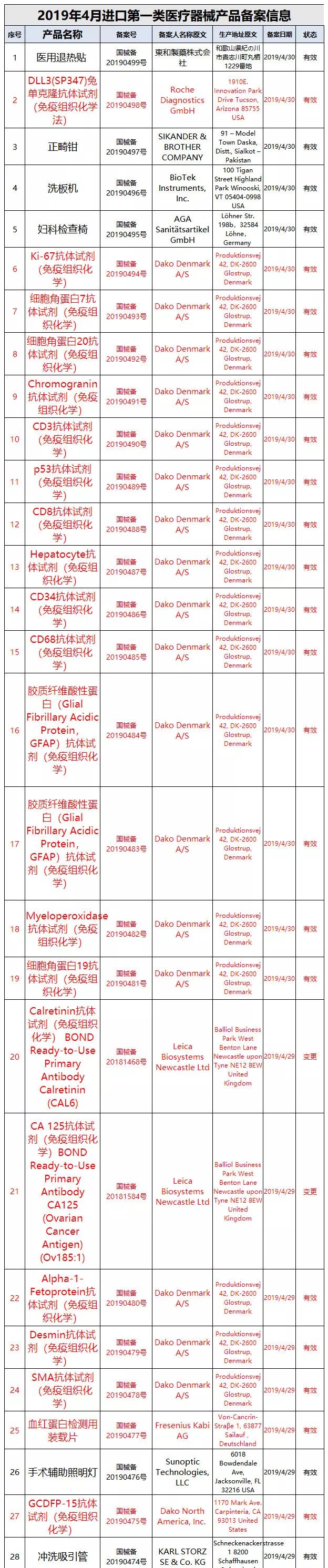 5月7日,国家药监局在其官网上公布了2019年4月进口第一类医疗器械产品备案信息。根据备案信息,本次获得批准的医疗器械产品共有237个,其中含体外诊断产品 27个。