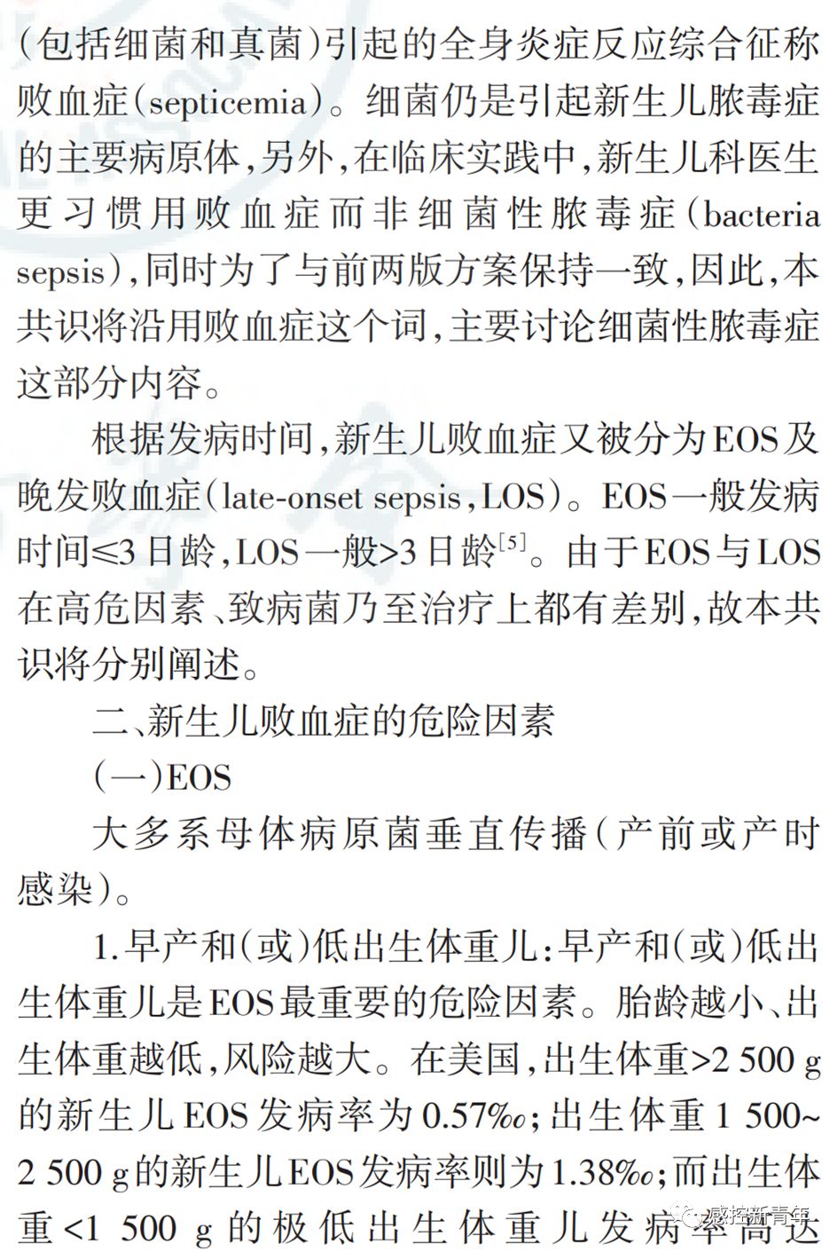 作者丨中华医学会儿科学分会新生儿学组 中国医师协会新生儿科医师分会感染专业委员会 来源丨中华儿科杂志, 2019,57(4) : 252-257. DOI丨 10.3760/cma.j.issn.0578-1310.2019.04.005 新生儿败血症诊断及治疗专家共识(2019年版) 新生儿败血症仍然是威胁新生儿生命的重大疾病,其在存活新生儿中的发病率为4.5‰~9.7‰。1986年及2003年中华医学会儿科学分会新生儿学组分别制定"新生儿败血症诊断标准初步方案""新生儿败血症诊疗方案"。近年来,病原谱发生变化,如B族链球菌(group B streptococcus,GBS)在早发败血症(early-onset sepsis,EOS)中检出有增高趋势;国内外专家对非特异性检查在新生儿败血症中指导价值的认识有所改变;在抗菌药物使用的观念、时机上也发生了变化。因此,中华医学会儿科学分会新生儿学组及中国医师协会新生儿科医师分会感染专业委员会于2016年5月成立共识制定工作组,历经3年,全面检索并评价相关文献,并经过多轮专家函审及会议讨论,结合我国实际国情制定"新生儿败血症诊断及治疗专家共识(2019版)"。本共识旨在进一步规范新生儿败血症的诊断及治疗,帮助新生儿科医生严格掌握抗菌药物使用及停用指征。 |