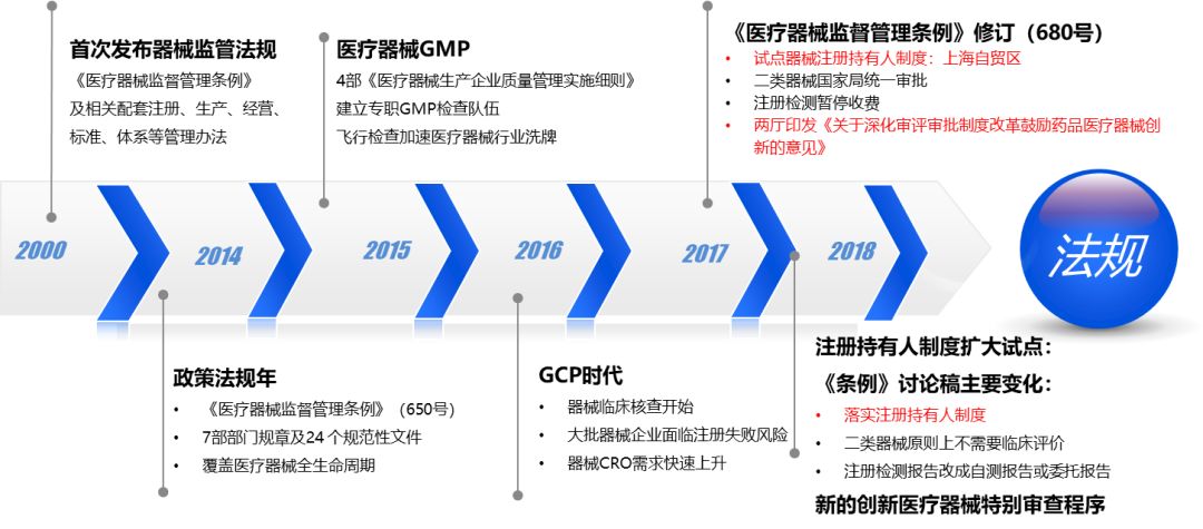 法规框架、注册流程 CFDA医疗器械法规体系 规范性文件 关于实施《医疗器械注册管理办法》和《体外诊断试剂注册管理办法》有关事项的通知(食药监械管〔2014〕144号) 国家药品监督管理局关于公布新修订免于进行临床试验医疗器械目录的通告(2018年第94号) 关于公布医疗器械注册申报资料要求和批准证明文件格式的公告(2014年第43号) 关于公布体外诊断试剂注册申报资料要求和批准证明文件格式的公告(2014年第44号) 关于医疗器械(含体外诊断试剂)注册申报有关问题的公告(第129号) 国家食品药品监督管理总局关于发布医疗器械生产质量管理规范的公告(2014年64号) 医疗器械全生命周期法规管理 法规贯穿于产品的整个生命周期 监管存在于产品的每一个阶段 全过程无缝隙的监管体系 医疗器械分类、注册 医疗器械注册流程 根据产品不同,具体周期有较大差异。 质量管理体系 •主要阶段 –体系策划 –文件编写 –体系运行实施 –内审&管审 –体系审核 –整改 •重点: –时间 –设计开发 –验证确认 产品检验 需要注意的几个问题: •技术要求应为设计开发的输出,涵盖产品的各项性能、安全指标; •技术要求的各项指标中,除特殊情况外,企业应可以进行自检/委托检验; •检验应选择具有该类产品检验资质的医疗器械检验机构; •除注册检验外,还应考虑生物相容性检测等其他测试。 医疗器械产品的要求 安全性 •不会损害医疗环境、患者安全、使用者及他人的安全和健康; •使用时潜在风险与患者受益相比较可以接受,并具有高水平的健康和安全保护方法 有效性 •在规定使用条件下应当达到其预期性能,满足适用范围要求。 风险分析、产品检验、生产质量管理体系、临床试验……其目的都是为了保障产品的安全性和有效性。 以多参数监护仪为例: 安全性 –标准要求 •安全:GB 9706.1-2007、 GB 9706.25-2005 •电磁兼容:YY 0505-2012 •产品:YY 1079-2008、 YY 0784-2010、 YY 0785-2010 •报警:YY 0709-2009 –安全防护 •心电防除颤 •防水等级IPX4 •生物相容性(与人体皮肤表面接触) •网络安全 有效性 –标准要求 •产品:YY 1079-2008、 YY 0784-2010、 YY 0785-2010 –性能指标 •准确性:心电、血氧、血压、体温监护 •分析功能:心电有心律失常分析等 •使用方面:可用性 •寿命测试、包装测试等 •…… 临床评价 豁免目录 1、列入免于进行临床试验目录的产品 提交申报产品相关信息与《目录》所述内容的对比资料; 提交申报产品与《目录》中已获准境内注册医疗器械的对比说明 同品种对比 2、通过同品种医疗器械临床数据进行分析 临床试验 注册申报 注册申报资料 软件研究 含有软件的产品,应当提供一份单独的医疗器械软件描述文档; 内容包括基本信息、实现过程和核心算法,详尽程度取决于软件的安全性级别和复杂程度; 应当出具关于软件版本命名规则的声明,明确软件版本的全部字段及字段含义,确定软件的完整版本和发行所用的标识版本。 具有网络连接功能以进行电子数据交换或远程控制,或采用存储媒介以进行电子数据交换,应当提供一份单独的网络安全描述文档。 产品说明书和最小销售单元的标签样稿 (一)产品名称、型号、规格; (二)注册人或者备案人的名称、住所、联系方式及售后服务单位,进口医疗器械还应当载明代理人的名称、住所及联系方式; (三)生产企业的名称、住所、生产地址、联系方式及生产许可证编号或者生产备案凭证编号,委托生产的还应当标注受托企业的名称、住所、生产地址、生产许可证编号或者生产备案凭证编号; (四)医疗器械注册证编号或者备案凭证编号; (五)产品技术要求的编号; (六)产品性能、主要结构组成或者成分、适用范围; (七)禁忌症、注意事项、警示以及提示的内容; (八)安装和使用说明或者图示,由消费者个人自行使用的医疗器械还应当具有安全使用的特别说明; (九)产品维护和保养方法,特殊储存、运输条件、方法; (十)生产日期,使用期限或者失效日期; (十一)配件清单,包括配件、附属品、损耗品更换周期以及更换方法的说明等; (十二)医疗器械标签所用的图形、符号、缩写等内容的解释; (十三)说明书的编制或者修订日期; (十四)其他应当标注的内容。 产品标签(有源产品) 未来发展趋势 医疗器械法规监管历程 创新特别审批和优先审批 逐步推行的医疗器械上市许可持有人政策 医疗器械注册人制度,是指符合条件的医疗器械注册申请人可以单独申请医疗器械注册证,然后委托给有资质和生产能力的生产企业(以下简称受托生产企业)生产,从而实现医疗器械产品注册和生产许可主体的可分离。 制度起源 2015-08 《国务院关于改革药品医疗器械审评审批制度的意见》,提出开展药品上市许可持有人制度试点。 药品试点 2016-06 《国务院办公厅关于印发药品上市许可持有人制度试点方案的通知》,明确药品试点要求。 上海先行 2017-03 《关于印发全面深化中国(上海)自由贸易试验区改革开放方案的通知》,允许自贸试验区内医疗器械注册申请人委托上海市医疗器械生产企业生产产品。 政策明朗 2017-10 《关于深化审评审批制度改革鼓励药品医疗器械创新的意见》,提出允许医疗器械研发机构和科研人员申请医疗器械上市许可。 第一张证书 2018-02 医疗器械注册人制度框架下的第一张注册证获批,为上海远心医疗