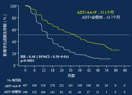 阿比特龙新适应症于2018年11月在中国获批,用于治疗新诊断高危转移性激素敏感性前列腺癌,自此中国患者进入了新型内分泌治疗方案时代。 2018年,中国前列腺癌(PC)治疗领域有两部重磅专家共识发布更新,分别为中国抗癌协会(CACA)发布的《2018版转移性前列腺癌诊治中国专家共识》及中国医促会发布的《前列腺癌新型内分泌治疗安全共识》。两部共识此次更新最大的亮点在于将阿比特龙作为转移性激素敏感性前列腺癌(mHSPC)的一线治疗推荐。 共识变更亮点: 阿比特龙使mHSPC患者显著获益 我们先来看看CACA泌尿男生殖系统肿瘤专业委员会的《2018版转移性前列腺癌诊治中国专家共识》。这部共识在正文开头第一段的显著位置就明确指出:近年来研究结果显示,具有高危因素的mHSPC患者加用阿比特龙和多西他赛治疗,其总生存(OS)时间能获得更明显的受益。 在CACA共识的mHSPC药物治疗部分,第一条推荐就是关于阿比特龙的:对于mHSPC患者,推荐雄激素剥夺治疗(ADT)联合阿比特龙1000mg(1次/d)联合泼尼松5mg(1次/d)治疗(证据级别1)。另外,对于低转移负荷患者,推荐ADT联合阿比特龙1000 mg(1次/d)联合泼尼松5mg(1次/d)治疗,或单纯ADT,或ADT联合抗雄激素类药物(CAB)治疗(证据级别3)(图1)。 图1 mHSPC的分类及治疗策略 医促会的《前列腺癌新型内分泌治疗安全共识》则指出,尽管如今针对mHSPC的治疗方案和新型治疗药物层出不穷,其标准治疗方案依然是3种:ADT、ADT联合多西他赛以及ADT联合阿比特龙。其中,阿比特龙是截至目前唯一在国内获批用于晚期PC患者的新型内分泌药物。作为mHSPC尤其是高肿瘤负荷mHSPC患者的标准联合治疗方案,其临床试验和真实世界的临床疗效与安全性都具一定优势。 专家共识推荐:针对mHSPC患者,尤其是高危患者(Gleason评分8~10,3处以上骨转移病灶或内脏转移等3项危险因素至少满足2项者),ADT联合阿比特龙应作为标准一线治疗方案。推荐剂量为1000mg口服,1次/d,与泼尼松5mg口服1次/d联用(表1)。 表1 阿比特龙治疗mHSPC的用药情境模式 注:推荐依据来源于III期随机对照临床试验 推动共识变更的两项大型临床研究 用药推荐的变更是基于大型循证研究结果之上的,近年来多项大型研究证实了阿比特龙治疗为mHSPC患者带来的获益。 阿比特龙是一种高效、选择性、不可逆的CYPl7酶抑制剂,能够阻断睾丸、肾上腺组织、PC组织中雄激素的合成。规范使用,可使PC患者血液和骨髓中的睾酮水平降至检测下限。 奠定了阿比特龙在mHSPC一线治疗地位的的两项重磅研究为:LATITUDE、STAMPEDE。2018年,这两项研究取得突破性进展并一致认为,针对高危mHSPC患者,阿比特龙联合泼尼松+ADT方案能降低患者死亡风险,推迟疾病进展及各项患者报告结局(PRO)指标,为患者带来全面获益。 LATITUDE研究是一项大型多中心随机对照III期临床研究,纳入了1199例高危mHSPC患者。最新数据显示,对于高危mHSPC患者,阿比特龙可使中位OS显著延长至53.3个月(95%CI 48.2-未达到),对照组仅36.5个月(95%CI 33.5-40.0);死亡风险降低34%(95%CI 0.56-0.78,p<0.0001)(图2)。 图2 阿比特龙联合泼尼松+ADT组死亡风险显著降低34% 在高肿瘤负荷组中,阿比特龙使影像学无进展生存(PFS)时间延长至33.1个月(95%CI 29.0-36.8),而对照组只有14.7个月(95%CI 14.5-16.1);显著降低影像学进展或死亡风险54%(95%CI 0.39-0.54,p<0.0001)(图3)。阿比特龙还能推迟PSA(前列腺特异抗原)进展时间(33.2个月 vs. 7.4个月,95%CI 0.26-0.35,p<0.0001)。 图3 阿比特龙显著延长高肿瘤负荷组PFS 在低肿瘤负荷组中,阿比特龙同样可以显著延长患者影像学PFS达49.8个月(IQR 29.6-55.2),对照组仅22.4个月(IQR 18.2-29.8);降低影像学进展风险达41%(95%CI 0.40-0.85,p=0.0048)(图4)。 图4 阿比特龙显著延长低肿瘤负荷组PFS 根据PRO数据,阿比特龙治疗可以显著延缓疼痛、疲乏进展,延长或维持至生活质量下降的时间,持续改善总体健康状况(图5),推迟症状性骨相关事件发生和化疗类药物的应用。 图5 阿比特龙延缓FACT-P总体评分恶化 注:FACT-P问卷包括一般肿瘤治疗的生活质量和PC特异生活质量评估 STAMPEDE是一项多臂多期的Ⅲ期随机对照试验,共纳入1917例PC患者。结果显示,阿比特龙可使死亡风险降低37%(95%CI 0.52-0.76;P<0.001)(图6),并使疾病进展风险下降71%(95% CI 0.25-0.34,P=0.377x10-11)(图7)。此外,联用阿比特龙可显著降低骨相关事件风险54%(95% CI:0.37-0.58,P=0.169x10-11)。 图7 阿比特龙+ADT组疾病进展风险下降71% 注:SOC=对照组,AAP=阿比特龙+泼尼松 这两项研究于2017年在ASCO(美国临床肿瘤学会)大会上发布,阿比特龙在第一时间得到国内外各大权威指南关于mHSPC一线治疗的力推。2018年11月,阿比特龙mHSPC适应症在中国获批,用于治疗新诊断的高危mHSPC。 直到目前,转移性前列腺癌的核心治疗仍是内分泌治疗,90%的患者对内分泌治疗敏感,有效期大约18-24个月;10%患者对内分泌治疗不敏感,有效期不超过半年。然而,既往的治疗对激素不敏感或有效期没有超过1.5年的患者没有进一步分层、没有采取积极的治疗措施,缺乏能够有效控制疾病进程、达到让人满意的治疗效果的药物。