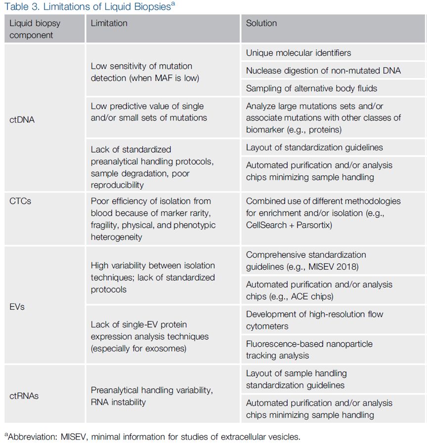 液体活检即循环肿瘤组学,是精确肿瘤学的创新领域,可以克服当前组织活检的局限性。 肿瘤循环组学中,循环肿瘤DNA(ctDNA)和循环肿瘤细胞(CTC)是美国FDA唯一批准用于指导临床应用的。 细胞外囊泡(EV),循环肿瘤RNA(ctRNA)和肿瘤教育/修饰的血小板(TEP)是相对较新的肿瘤组成成分,但在癌症治疗的每个阶段都具有很大潜力。 本文主要讨论肿瘤循环组学各成分的临床应用以及目前限制其在临床应用实施的主要因素。 (续) 细胞外囊泡EV EV是在生理和病理条件下从所有细胞类型中释放的膜状颗粒,是在不同刺激下产生的,如蛋白酶、ADP、凝血酶、炎性细胞因子、生长因子、生物力学剪切和应激诱导物以及凋亡信号等刺激。 EV几乎存在于所有体液中,尤其是血液中。 一度认为EV是细胞消除非必需成分的简单途径。过去十年的发展中,EV被认为是细胞间通讯的基本介质,调节和参与多种生理和病理过程,包括癌症的调节。 基于EV不同的的生物发生、内容物和分泌途径,可将EV分为两大类:外泌体和微泡。 细胞外囊泡作为癌症生物标志物的临床意义 EV携带的分子成分被认为是细胞起源的分子指纹,基于此EV适用于肿瘤生物标记物。与ctDNA和CTC相比,EV在临床癌症诊断中的应用受限,限于EV的分离、分析灵敏度以及稳定性,EV具有较多潜在优势。与CTC相比,EV通常大量生产和释放,在外部脂质膜保护下维持着囊泡成分的稳定性。 与ctDNA和CTC类似,EV可用于定量和定性分析。EV的定量信息可预测恶性疾病和肿瘤负荷的存在。例如,乳腺癌和胰腺癌患者的循环外泌体水平显著增高,多发性骨髓瘤(MM)患者的循环微粒(MP)的数量比健康个体多。此外,循环MP有望应用于晚期NSCLC的诊断和预后。 EV中包含的核酸和蛋白质成分等可提供定性信息。 EV中的编码和非编码(nc)RNA等RNA成分已被广泛研究。 外泌体DNA最近作为生物标志物而受到关注,例如在胰腺癌患者的血清外泌体中检测到KRAS和TP53的突变。 另一项研究中证实,胰腺导管腺癌(PDAC)患者的外泌体KRAS突变比CA 19-9具有更好的预后分层。 EV囊内和膜上都携带有蛋白质,并且已有多篇报道证明EV蛋白可作为癌症生物标志物。 Melo等人证明了循环外泌体磷脂酰肌醇蛋白聚糖-1(GPC1)可区分PDAC与健康人群,准确度高达100%。 最近,Moon等人证明了EV Del-1和纤维连接蛋白可作为早期乳腺癌诊断的生物标志物。 此外,已证实MM中循环CD138 + MP水平增加,并且CD138 + MP在预测患者复发风险和治疗反应方面具有显著预后作用。 最后,annexinV + EpCAM +去唾液酸糖蛋白受体-1(ASGPR1)+循环MP可用于肝细胞癌和胆管癌的诊断,CD147 + EpCAM + MP是CRC的预测因子。 EV分离和分析技术以及最新进展 限制EV作为液体活检应用于临床的最大问题是缺乏样品处理和EV分离分析的标准化流程,这影响临床应用的可重复性。目前EV的分离程序包括许多生物样本处理步骤,并且EV易受到不同类型的物理和化学损伤,可能损害EV和/或改变它们的生物和物理性质。 影响EV研究可重复性的另一个因素是缺乏EV命名和定义的标准化指南,以及验证所需的对照实验。 为了克服这些局限性,国际细胞外囊泡学会最近更新了全面的指南和建议集。 与CTC类似, EV的传统分离方法是利用物理(密度和大小)和生物(表面标记的表达)特性。 EV分离最常用的方法是基于密度的方法,例如差速离心和/或超速离心和密度梯度离心。其中,差异超速离心技术被认为是金标准技术,尤其是用于外泌体纯化。 虽然这些技术使用广泛,但设备昂贵、耗时,且不能保证产物纯度,通常使用中会找到纯度和回收率的折衷点。 过滤和尺寸排阻色谱(SEC)是基于尺寸技术。 过滤可得到高产率和高纯度产物,但受限于EV对过滤器的粘附和高压引起的囊泡损伤。 与超速离心相比,SEC可以更好地回收EV。 免疫亲和捕获方法使用了与EV表面标志物的抗体缀合的磁珠。 该方法的优点是可产生高纯度的EV成分,可基于表面标记物分离出特定的EV子集。 相比之下,这个特征也受限制,可能所选标记物缺少表达而遗漏了潜在重要的EV亚群。免疫亲和捕获与微芯片的整合技术,可进行原位免疫分析[57]。 另一种常用的外泌体分离方法是聚合物沉淀法。 该方法使用聚合物[例如聚乙二醇(PEG)]来降低EV的溶解度,再通过快速低速离心进行沉淀。 该方法产率高,但纯度低。 最近出现了EV电场分离法。Lewis等人开发了一种交流电动(ACE)芯片,能够在30分钟内从全血中捕获外泌体并进行原位免疫荧光分析。作者通过评估GPC-1和CD63的适用性来验证该芯片可用于PDAC的诊断标志物。 最后,有一种基于微流体的新型EV分离方法。该基于不同的EV特性,例如基于纳米尺度的过滤法、具有抗体功能的微流体通道和螺旋惯性微流体装置。Ko等人最新开发了一种磁性纳米孔分选平台,该平台已被用于分离特定癌症来源的EV。他们使用该系统鉴定PDAC小鼠模型的miRNA特征,设计机器学习算法用于不同癌症状态的分类。微流体技术旨在促进实验室芯片系统的开发,以实现快速、经济、集成的EV隔离和分析,用于EV的即时诊断。 EV检测方法也正在发展进步,尤其在蛋白质成分分析方面。常用的分析技术包括WB、ELISA、质谱(MS)和流式细胞仪(FCM)。除FCM外,这些技术主要用于EV批量分析,而不评估个体差异。 FCM目前用于单MP表征分析,但受限于小尺寸而无法分析单个外泌体。 目前外泌体FCM分析涉及多个外泌体与较大珠子