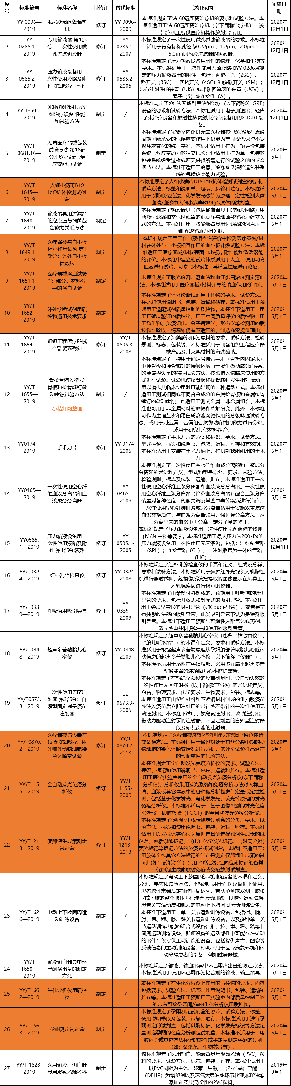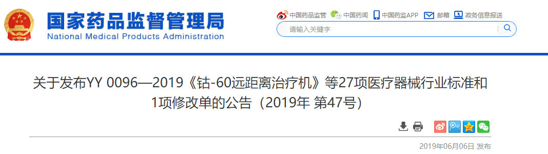 YY 0096-2019《钴-60远距离治疗机》等27项医疗器械行业标准和YY0285.3-2017《血管内导管 一次性使用无菌导管 第3部分:中心静脉导管》医疗器械行业标准第1号修改单已经审定通过,现予以公布。标准编号、名称、适用范围、实施日期和修改单内容见附件。 特此公告。