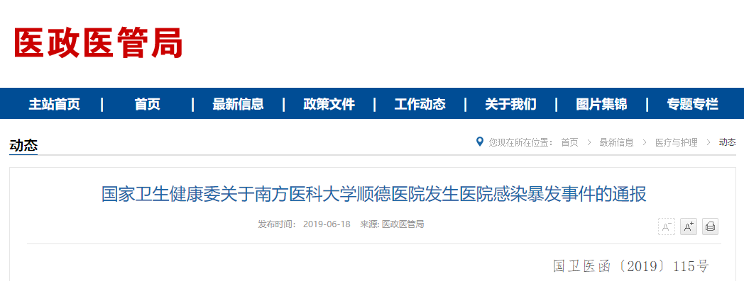 各省、自治区、直辖市及新疆生产建设兵团卫生健康委: 2019年4月,南方医科大学顺德医院(以下简称顺德医院)发生一起医院感染暴发事件,导致多名新生儿死亡。现已查明,该事件是一起由肠道病毒(埃可病毒11型)引起的医院感染暴发事件,共导致19例感染,其中5例死亡。这次事件性质恶劣,后果严重,现予以通报如下: 一、事件基本情况 自4月1日起,顺德医院新生儿科陆续出现多例患儿不明原因发热,至4月14日停止接收患儿。在此期间,医院共收治患儿120例,其中27例出现不同程度发热症状。9日起,医院开始分批向外院转送患儿,先后安排37例患儿转至其他医院治疗,但未如实告知接收医院转诊原因。4月3—20日期间,有5例新生儿相继死亡。此次事件暴露出当地卫生健康行政部门和部分医疗机构“以病人为中心”的理念淡化,质量安全意识缺失,医德医风教育不足等一系列问题。 (一)顺德医院存在的问题。 1.医院感染管理制度不健全、落实不到位。医院对医院感染管理工作重视不够,对《医院感染管理办法》及有关管理规定执行不力,存在医疗安全隐患。医院感染专职人员配置不足,难以保证工作的连续性。医院感染管理委员会流于形式,未提出具有针对性的问题和解决问题的方案,未真正发挥决策作用。相关培训和医院感染暴发演练不到位,一些医务人员对医院感染相关制度不知晓,工作人员对医院感染暴发报告和处置相关规定不熟悉。 2.医院感染防控意识和敏感性不强。未按照《医院感染管理办法》的规定进行有效的医院感染监测,未及时发现医院感染病例和医院感染隐患。2018年至今未开展新生儿科目标性监测,未及时发现医院感染的危险因素并进行风险管理。违反规定将患儿分批转院,未如实告知接收医院转诊原因。4月1—14日,该院多例患儿陆续出现不明原因发热症状,明显高于既往平均水平,但医院感染意识淡薄、敏感性不强、处置措施不力。 3.医院感染管理不科学不规范。出现疑似医院感染病例后,医院没有按照规定程序及时报告,违反规定对“疑似医院感染”患儿采取转送外院的处理措施。省调查组进驻后,仍发现该院部分喉镜、雾化机等医疗用品和设施的清洁消毒不规范,配奶过程存在洁污交叉,日常消毒和感染防护工作不到位等问题。 (二)卫生健康行政部门存在的问题。顺德区卫生健康局对事件处置不当,调查失实,向佛山市卫生健康局未报告患儿死亡及多名患儿转院情况,未充分履行报告及调查处理职责。佛山市卫生健康局对顺德区报告中提及的“未排除院内感染的可能”有关情况不核实、不上报,事件多个环节的处理都存在漏洞,导致事态恶化。市、区卫生健康局对医院感染的日常检查和监督不力,未能及时发现重点区域、重点人员、重点环节存在的风险隐患。 (三)其他医院存在的问题。广东省妇幼保健院、南方医科大学珠江医院对短期内由同一医院转来多名重症感染患儿没有足够的敏感性,对转入患儿没有专业评估,医院感染防控存在漏洞。 二、事件处理结果 广东省已根据《中国共产党问责条例》《医院感染管理办法》等规定,对顺德医院、佛山市卫生健康局、顺德区卫生健康局主要负责人、相关责任人予以处理。广东省卫生健康委撤销顺德医院三级甲等医院资格、收回证书和标识,责令顺德医院针对存在的问题限期整改,对广东省妇幼保健院、南方医科大学珠江医院予以通报批评。 三、工作要求 本次事件是由于医院管理工作松懈,医院感染防控规章制度不健全、不落实,未按规定报告医院感染等造成的一起严重医疗事故。各级卫生健康行政部门和各级各类医疗机构必须吸取教训,举一反三,引以为戒。要提高政治站位,强化“以病人为中心”的理念,坚守质量安全底线,加强医德医风教育,持续改进医疗服务质量。 (一)切实增强责任意识,加强医院内部管理。医疗机构要站在维护人民群众健康权益的高度,树立底线意识,强化岗位责任,高度重视医疗质量和医疗安全管理。要按照相关法律法规、规章制度等要求,进一步落实医疗质量安全核心制度,采取有力有效措施,消除医疗安全隐患,防范化解风险,以高度负责任的态度为人民群众提供高质量的医疗服务。 (二)高度重视医院感染,最大限度降低感染风险。医疗机构要严格执行《医院感染管理办法》和相关技术规范,建立感染预防与控制责任制。加强感染监测,及时发现感染隐患,严格落实医院感染报告制度。加强对医务人员的教育培训,提高防范医院感染的责任意识和能力水平。切实加强新生儿病房、重症监护室、手术室等重点科室的感染防控工作,避免再次发生类似事件。 (三)履行监督管理职责,切实保障质量安全。各级卫生健康行政部门必须认真履行对医疗机构的日常监管职责,加强对医联体的监督、指导,防止托管机构发生“托而不管”问题。要提高业务能力和敏感性,对医院感染事件及时进行调查处置,将医院感染防控作为“一票否决”项纳入医院评审、评优评先等工作。对发现的薄弱环节及风险隐患要督促医疗机构及时采取有效措施处理,造成严重后果的,要依法依规严肃处理。 各省级卫生健康行政部门要在辖区内开展医疗机构感染预防与控制专项排查工作,于6月底前将工作情况书面报送我委。 联系人:医政医管局医疗处 李大川、张文宝 联系电话(传真):010-68792206 电子