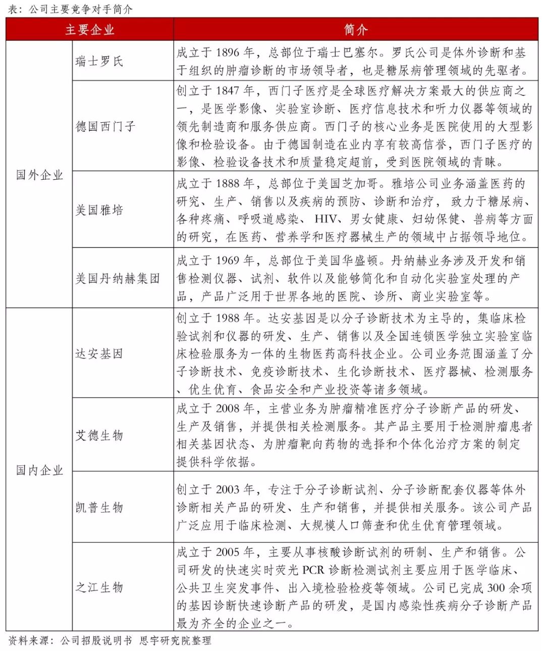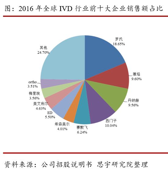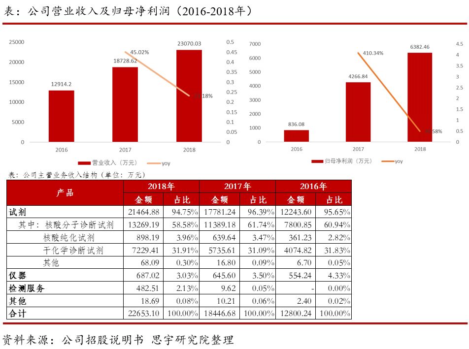 公司拥有具有自主知识产权的现代生物学技术平台,已成功开发覆盖传染病检测、肿瘤筛查、女性生殖道微生态检测等多个领域的近500个产品。 二、公司主要产品及核心优势 公司主要产品为核酸分子诊断试剂、核酸纯化试剂、干化学诊断试剂及检测仪器,广泛应用于传染病防控、临床检测、大规模人口筛查和优生优育管理等领域。 公司在国内首先倡导多重荧光定量 PCR 检测,依托涉及多重检测、熔解曲线、引物探针标记修饰、新型扩增体系、个性化样本预处理等多个技术领域的多重荧光定量 PCR 技术平台,在分子诊断领域处于技术领先地位。公司以多重荧光定量 PCR 技术为基础,同时融合 TaqManTM 探针、AllGloTM 探针、MGBTM 探针、LNA 修饰技术以及熔解曲线分析技术,实现对靶标的多重以及高通量检测。公司将多重荧光定量 PCR 技术与熔解曲线分析技术相结合,开发了多通道熔解曲线分析技术。 基于机电一体化、人工智能、图像处理、传感控制、大数据、计算机软件等先进技术,公司自主研发的医学图像分析诊断系统,能快速准确的识别出视野内的菌群类别及位置,实现了直观便捷的形态学检查,并结合客观准确的自动化功能学检测结果,可快速诊断临床常见的各种阴道炎症,有效改善了传统手工检测依靠经验、漏检误判率高等状况,完成了阴道炎检测从手工到自动化、智能化的转变。 三、公司业绩稳定增长 2018年,公司营业收入达2.31亿元,同比增长23.18%;归母净利润6382万元,同比增长49.58%;其中,核酸分子诊断试剂销售金额达1.33亿元,占比58.58%,近三年公司业绩稳定增长。 四、主要竞争对手分析 2016年全球体外诊断市场规模达到600亿美元,预计到2020年可以达到700亿美元,未来三年的年均复合增长率预计将维持在4%左右;2016年中国体外诊断市场规模达到450亿元,年平均复合增长率约为16%,预计未来三年仍将保持16%的增长速度,到2020年,中国体外诊断市场规模预计将超过800亿元。 从全球来看,全球的体外诊断行业进入稳定增长期,产业发展成熟,市场集中度较高,主要企业包括Roche、Siemens、Abbott、Beckman、Becton Dickinson、BioMerieux、 Bio-Rad Laboratories等。 从国内来看,我国的体外诊断试剂行业已从导入期步入发展期,市场需求快速增长。目前国内市场中,不仅包含了西门子、罗氏、雅培等跨国公司,很多优秀的国内企业也凭借自身较高的产品性价比和更为贴近本土市场的优势,逐渐占据一定市场份额,其中包括达安基因、艾德生物、凯普生物、之江生物等。 五、主要风险分析 1. 市场竞争加剧的风险 虽然目前国内体外诊断市场快速发展,但由于其市场化程度较高,国外企业可以全面参与国内市场的竞争。国外企业凭借产品先发优势、技术先进的试剂与配套仪器等优势,在国内的三级医院等高端产品市场处于优势地位。而国内多数企业以生产中低端诊断产品为主,企业规模较小,尚未形成稳定的市场格局。如果公司未来不能继续保持在技术与产品、服务与市场、品牌、客户信任等方面的优势,激烈的市场竞争环境可能会对公司生产经营和盈利能力造成不利的影响。 2. 产品价格下降的风险 根据国家现行的相关规定,凡是进入《医疗机构临床检测项目目录》的非营利性医疗机构服务项目的最高价格标准由各地价格主管机关负责制定和调整。随着国家医疗改革的深入及相关政策法规的进一步调整,相关主管部门存在下调部分检测项目价格的可能,从而可能导至试剂产品采购价格的下降。此外,同类新产品推出导至竞争加剧、技术革新等均可能导至公司试剂产品的价格下降,进而对公司的毛利率水平和收入水平造成不利影响。 |