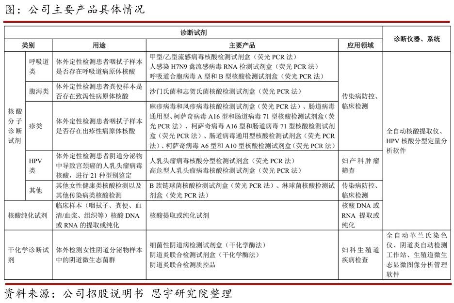 导语: 本次科创板中医疗器械绝对是最受关注的领域之一,而体外诊断领域又是医疗器械行业中市场规模最大的行业。从覆盖的诊断方式来看,申报科创板的各家公司又各有特色,如东方基因、硕世生物分别包括POCT诊断和分子诊断,而浩欧博、热景生物则主要为传统的生化诊断和免疫诊断。今天,我们就来聊聊其中的一家,国内领先的体外诊断产品提供商——硕世生物。 一、公司专注于体外诊断领域 公司成立于2010年,是国内领先的体外诊断产品提供商,专注于体外诊断试剂、配套检测仪器等体外诊断产品的研发、生产和销售,并拓展到体外检测服务领域,实现“仪器+试剂+服务”的一体化经营模式。
