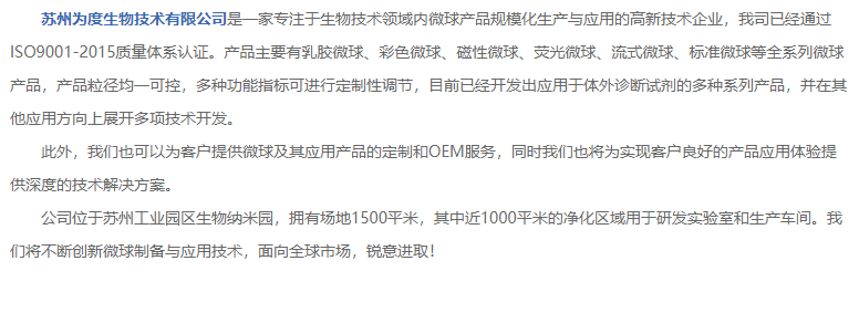 : 苏州为度生物技术有限公司是一家专注于生物技术领域内微球产品规模化生产与应用的高新技术企业