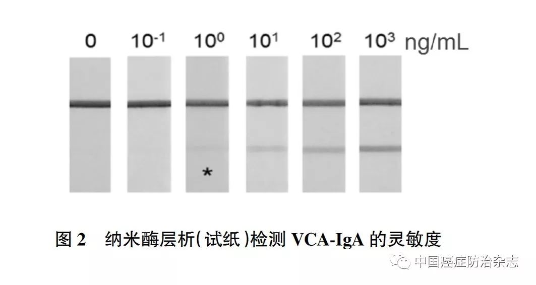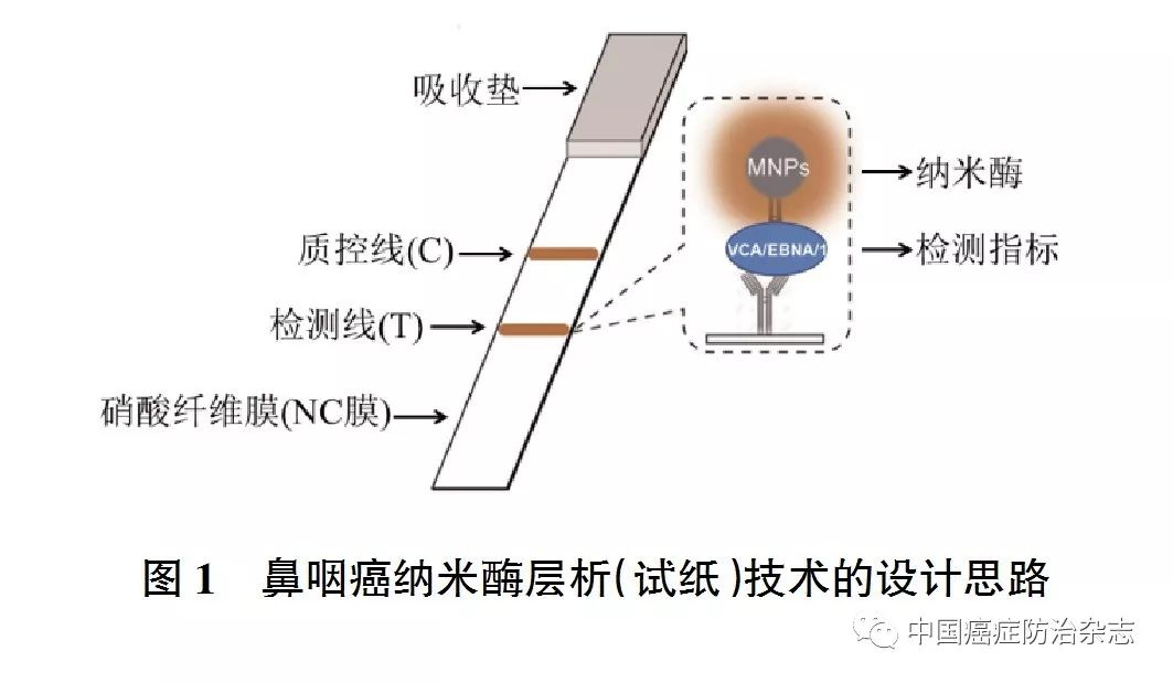 1.2.7   EBV抗体检测新技术——纳米酶层析(试纸)技术   目前鼻咽癌血清学检测方法主要有ELISA法和胶体金免疫(试纸)层析法。ELISA法灵敏度和特异度高,且可同时检测多种抗体,但是操作复杂、效率较低,费用较高,对检测设备有要求,不适合在偏远地区开展鼻咽癌早期筛查工作。胶体金免疫(试纸)层析法简单、快速、无污染,但是灵敏度较低,假阳性率高,具有较高的漏诊风险。纳米酶层析(试纸)技术整合了ELISA高灵敏度和高特异度的特性,又具备胶体金免疫(试纸)层析法简单、经济和快速特点,是理想的鼻咽癌早期筛查和诊断技术。