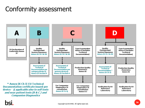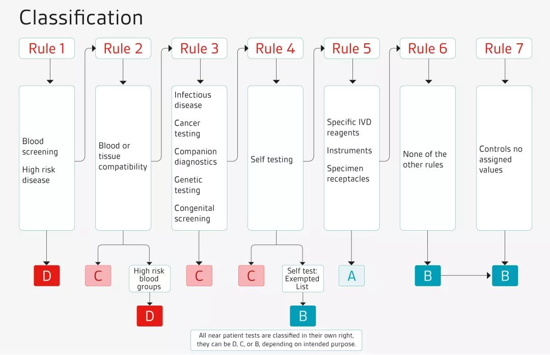 产品分类的规则由原来基于清单(list),变成了基于规则。按照附录VIII的七条规则将IVD产品分为A、B、C、D四类,其中A类为最低风险,D 类为最高风险类产品。 A类非灭菌产品自我声明即可,B、C、D类产品则需要公告机构审核技术文件和体系。 B类和C类产品需获得体系CE证书,而B类C类产品的体系CE证书包含对技术文件抽样审核的要求,其中B类产品技术文件按照category抽样,C类产品则按照Generic device group 抽样。 对于D类产品,除了体系证书的要求之外,还需要通过参考实验室的检测, 及对每个产品的技术文件进行评审以获得产品CE证书。 对于B类、C类或D类的自测式,或床边诊断类,或伴随诊断类,也需要额外获得针对这些产品特性的产品CE证书,才能上市销售。另外,对于伴随诊断的产品,还需咨询主管当局。