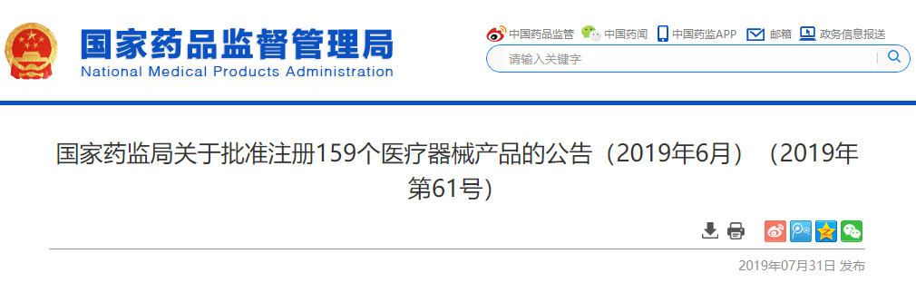 2019年6月,国家药品监督管理局共批准注册医疗器械产品159个。其中,境内第三类医疗器械产品106个,进口第三类医疗器械产品34个,进口第二类医疗器械产品18个,港澳台1个(具体产品见附件)。