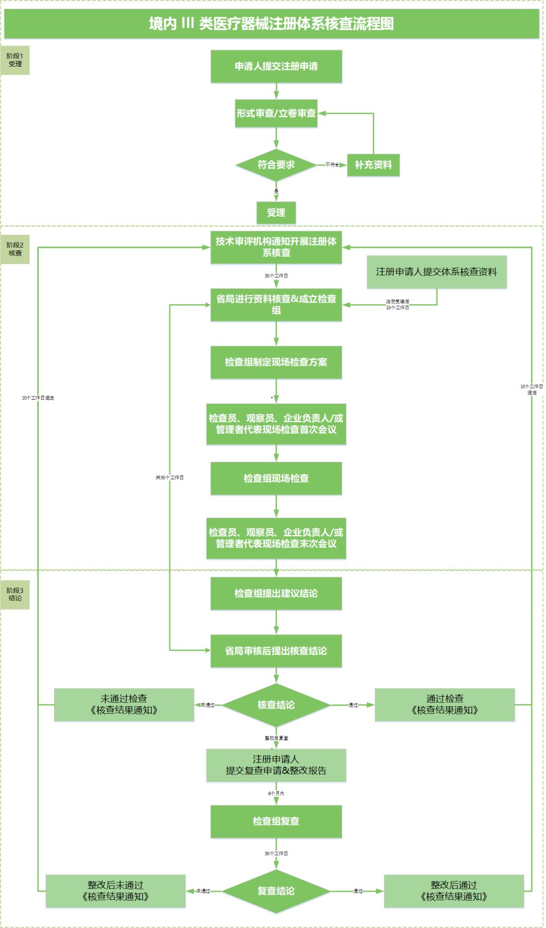 昨天(8月19日),器审中心发布《器审中心开展注册质量管理体系核查现场审评工作》。你对注册体系核查了解多少?小编觉得注册体系核查倒像是“事先通知的飞检”,现场检查发现的问题,同样需要进行整改。今天我们就来聊聊注册体系核查那些事: 注册体系核查 根据2015年6月,原国家总局发布了《境内第三类医疗器械注册质量管理体系核查工作程序(暂行)》(食药监械管[2015]63 号),规定境内第三类医疗器械(含IVD)注册申报时,国家局审评机构应通知省局药监部门开展注册质量管理体系核查,必要时审评人员应参与核查。 省局组织检查组进行现场检查,检查结论为“通过检查”、“整改后复查”、“未通过检查”,未通过检查的,技术审评机构提出不予注册的审评意见,药品监管部门作出不予注册的决定。 “整改后复查”的,未在规定期限内提交复查申请和整改报告的,以及整改复查后仍达不到“通过核查”要求的,核查结论为“整改后未通过核查”。整改后通过核查的,核查结论为“整改后通过核查”。 整个流程为:审评机构决定受理注册申请后,在30个工作日内通知地方局开展注册体系核查工作;检查组应根据具体情况制定现场检查方案,最后由地方局生成核查结论,以下是具体流程: 2018年10月,器审中心制定了《医疗器械技术审评中心参与境内第三类医疗器械注册质量管理体系核查操作规范(试行)》,又提出了现场审评主要关注重点: (一)设计开发 可查看企业的设计开发程序文件、计划书、决定书、图纸、工艺流程、工艺规范、设备人员要求、评审报告、验证方案、验证报告、确认报告等。