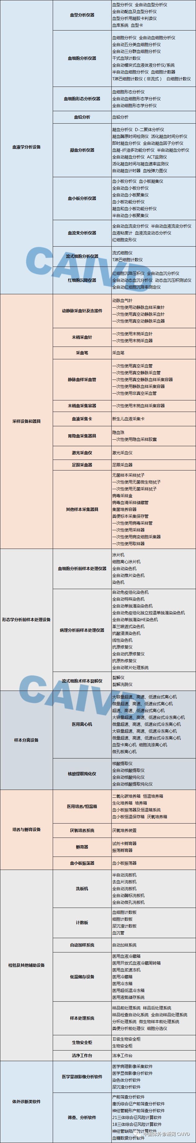 体外诊断,即IVD(In Vitro Diagnosis),是指在人体之外,通过对人体样本(血液、体液、组织等)进行检测而获取临床诊断信息,进而判断疾病或机体功能的产品和服务。检测过程中所需要的仪器、试剂、耗材组成了IVD系统, 而从事这些仪器、试剂、耗材研发、生产和营销的企业就形成了IVD产业。随着社会的发展,对IVD行业也提出更高的要求,既要做到快速检测、又要做到检验测定结果精准为临床诊断、治疗争取宝贵的时间。 体外诊断仪器主要分为:生化分析设备、电解质及血气分析设备、免疫分析设备、分子生物学分析设备、微生物分析设备、尿液及其他样本分析设备、其他医用分析设备、血液学分析设备、采样设备和器具、形态学分析前样本处理设备、样本分离设备、培养与孵育设备、检验及其他辅助设备、体外诊断类软件等。 小编整理了检验科常用设备名录,以供参考: 来源:中国体外诊断网CAIVD |