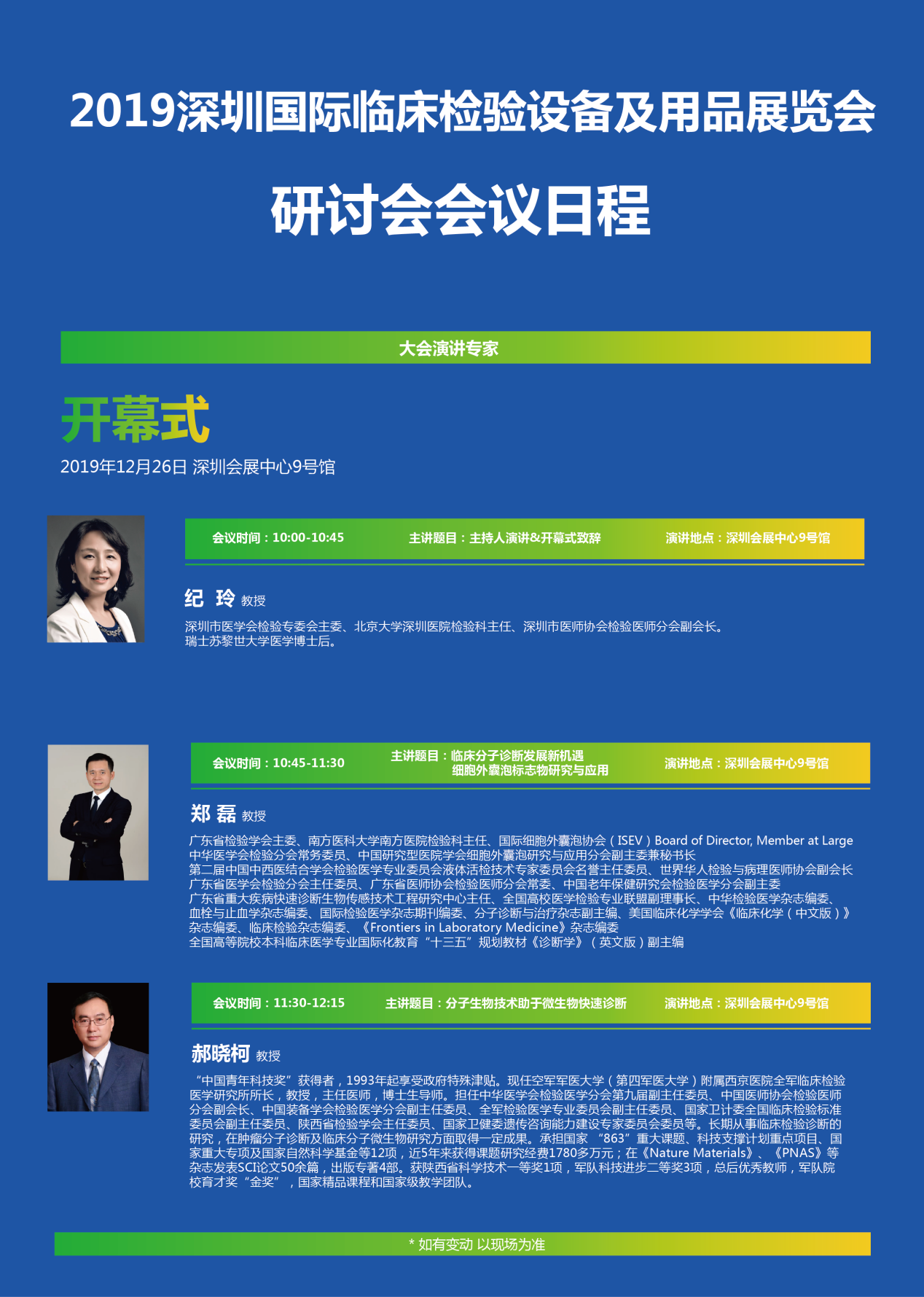 阁下您只要是以下行业的客户都可以来参观本次展会: 医院、临检中心、疾病预防控制中心、血站、血液中心、医药公司、医科大学、医学院校、实验室、科研单位、妇幼保健院、诊所、社区医疗卫生中心、医学会、协会、药店、医药连锁机构、体检中心、出入境检验检疫、经销商、代理商、渠道商、进出口公司、贸易公司等领域 参观地点:深圳会展中心9号馆(深圳市福田区福华三路) 参观时间:2019年12月25日(09:00 - 17:00) 2019年12月26日(09:00 - 17:00) 2019年12月27日(09:00 - 15:00) 咨询电话:021-64126716 大会网址:www.shlcjyexpo.com