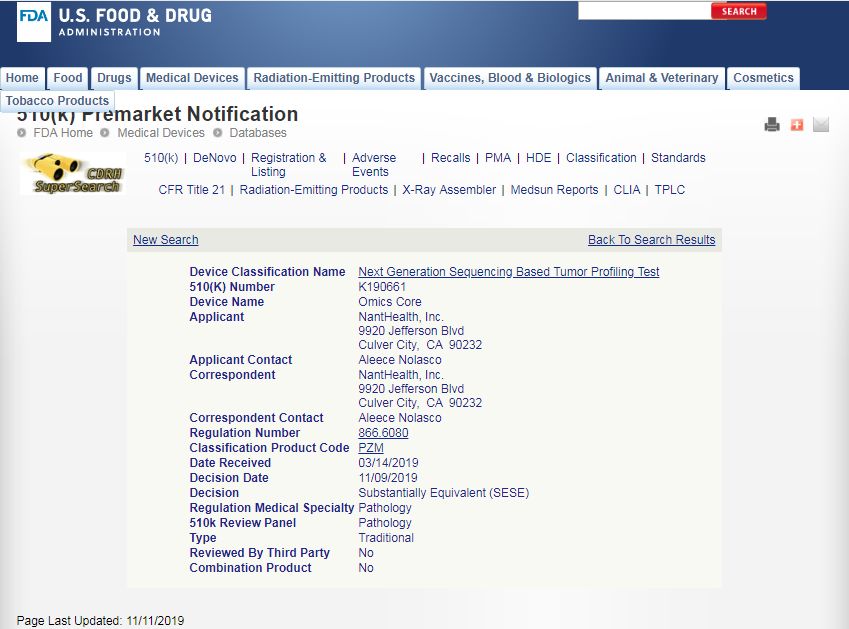 近日,美国食品药品监督管理局(FDA)已批准NantHealth公司Omics Core平台的 510(k) 申请。Omics Core是一种基于全外显子测序的体外诊断产品,可检测癌症组织中的总体肿瘤突变负荷(TMB)和468个癌症相关基因的体细胞突变。这是美国FDA批准的首个检测实体瘤中总体TMB的全外显子组体外诊断产品,对癌症的临床诊断和治疗具有里程碑意义。 据悉,NantHealth研究团队根据纪念斯隆·凯特琳癌症中心的MSK-IMPACT下一代基因检测分析平台对Omics Core进行了验证,并基于此向FDA提交了申请。值得注意的是,Omics Core产品与MSK-IMPACT 468基因检测不同,该产品可对来自患者癌症样本和匹配正常样本的19,396个蛋白质编码基因进行测序,靶向人类基因组的3,900万个碱基对(39 Mb),报告癌症样本的总体TMB以及468个癌症相关基因的体细胞突变,包括点突变、小片段插入和缺失。FDA批准Omics Core平台的 510(k) 申请截图 Omics Core平台报告的总体TMB是基于全外显子组中体细胞非同义变体的总数,并通过计算基因编码区中检测到的所有体细胞、同义和非同义变体来估计突变率。通常,人们是根据基因panel测序中常用的TMB公式来推测总体TMB。NantHealth方面表示,通过联合分析癌症样本和匹配的正常样本,Omics Core平台可确定癌症样本中真实的总体TMB。同时,该平台可检测与MSK平台相同的468个癌症相关基因,其等位基因频率降低至2%,有助于指导医生进行癌症治疗决策。目前,TMB被认为是多种癌症类型的关键生物标志物,是预测患者对检查点抑制剂治疗反应的新兴生物标志物,可识别可能受益于免疫治疗的癌症患者。已有研究表明,与低TMB相比,高TMB患者的免疫治疗效果更好。PatrickSoon-Shiong(黄馨祥) NantHealth董事长兼首席执行官PatrickSoon-Shiong(黄馨祥)表示:“鉴于TMB在精准医学中的应用潜力巨大,因此利用更准确、更全面的分析方法进行TMB检测分析,可帮助使医生确定哪些癌症患者可以从免疫检查点抑制剂和免疫疗法中受益。我们的研发、监管和生物信息团队耗费近十年时间完善了这一检测。该平台可检测整个外显子组中的绝对突变数量,这些突变来自癌症样本和匹配正常样本的基因组。我们相信,与在有限基因组序列中广泛使用的TMB公式推测法相比,这种全面的诊断方法将提供更高的准确性。” NantHealth首席医学官SandeepBobby Reddy博士认为:“Omics Core是FDA授权的针对TMB的第一个全外显子组检测平台,标志着肿瘤学的分水岭。现在,临床医生可以通过癌症和正常样本的配对测序直接检测患者癌症样本中的突变,并且其获取的结果经过了充分验证,以支持更好的治疗决策。此外,全外显子组范围意味着我们可以鉴定出更多的新位点和新靶点,来支持新疫苗和新药的开发,还可以开发新的方法治疗此前无法治疗的靶点。”对于Omics Core平台的获批,ImmunityBio基因组学总裁Steve Benz博士表示:“有多个团队的研究结果,包括我们2018年在ASCO上的报告,都显示了进行全外显子组测序以检测总体TMB的重要性。当利用基于panel的方法推断时,我们得到的TMB值被高估了3倍,这可能导至医生为不太可能响应的患者开出超过限量的免疫检查点抑制剂。鉴于这些治疗方法高昂的成本以及发生不良事件的可能性,尽可能准确地确定最适合接受某种治疗的患者人群至关重要。”ImmicityBio首席科学官ShahroozRabizadeh博士认为:“利用全外显子组测序确定TMB是定义新表位(neoepitopes)的第一步。这些独特的肿瘤突变可被T细胞识别并引发免疫抗肿瘤反应。高TMB的患者通常具有更多的新表位,这些新表位可将杀死癌症的T细胞吸引到肿瘤微环境中。根据全外显子组TMB中鉴定的新表位可以开发针对新的疫苗,这些疫苗可用于目前有限基因组测序未覆盖的> 95%的蛋白质编码基因,以及尚未被药物直接靶向的> 99%的基因。Omics Core在TMB报告中的分析性能和有效性而获得的认可,为精准癌症免疫治疗时代开启了新篇章。”需要注意的是,Omics Core检测可提供体细胞突变和TMB信息,可供合格的医疗保健专业人员根据专业准则使用,并不是确定或规定性地指导使用任何特定的治疗产品。 TMB是免疫治疗一个潜在的泛肿瘤生物标志物。在肺癌、黑色素瘤、膀胱癌等实体瘤中,高TMB患者的应答更好,生存获益也更持久。虽然癌症组织全外显子测序是公认的检测TMB的金标准,但其测序成本较高、周期长,并且对肿瘤组织标本大小和标本的肿瘤组织含量有较高要求,因此在临床实践中难以广泛使用。2016年,FDA批准了两种基于CGP(Cancer Gene Panel)的NGS检测方法用于检测组织TMB,即MSKCC的MSK-IMPACT™-468基因和Foundation Medicine的Foundation One CDx™-324基因。已有研究结果显示,基于CGP的NGS检测方法与使用WES检测方法得到的结果高度一致。本次FDA批准的针对TMB的基于全外显子测序的体外诊断产品,或为癌症的临床诊断和治疗带来新的发展契机。相信随着研究的不断深入,与TMB配套的分子诊断技术或将迎来良好的发展。参考资料: 1. NantHealth Announces FDA MarketingAuthorization of Omics Core℠: The Nation’s First Tumor-NormalMutation Profiling of Overall Tumor Mutational Burden from Whole ExomeSequencing in Solid Tumors 2. FDA Clears NantHealth Tumor-NormalWhole-Exome Test 3. NantHealth’s Omics Core TMB Assay WinsFDA Authorization |