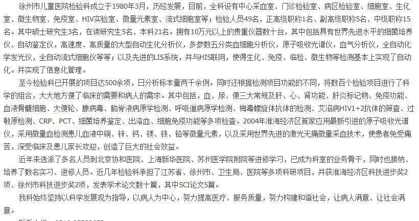 摘要: 徐州市儿童医院检验科成立于1980年3月,经历发展,目前,全科舍友中心采血室、门诊检验室、病区检验室、细胞室、生化室、微生物室、免疫室、HIV实验室、微量元素室,流式细胞室等;